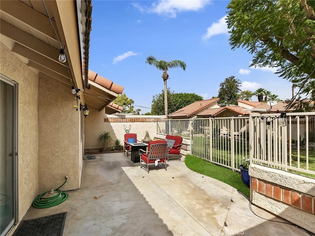 Discover desert living at its finest with this charming two-bedroom, two-bathroom, single-level condo, perfectly situated in Indian Palms Country Club. This beautifully furnished home boasts high ceilings, ceiling fans, and the popular open-concept great room floor plan thats ideal for relaxation and entertaining. Just across the street from the community pool, youll enjoy both convenience and privacy. The front courtyard features a built-in BBQ, perfect for outdoor dining, with easy access to the kitchen through a sliding glass door. The back patio is a serene, landscaped retreat with a fire pit and lounge chairs, where you can unwind under the starry desert sky. Indian Palms Country Club offers a wealth of amenities, including a Lifestyle Center with a gym, tennis, pickleball, bocce ball, and a golf course (with fees). Residents also enjoy access to the clubhouse, restaurant, and bar, adding to the vibrant community lifestyle.