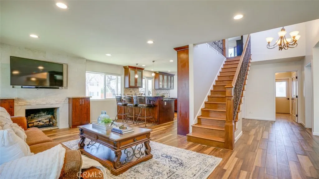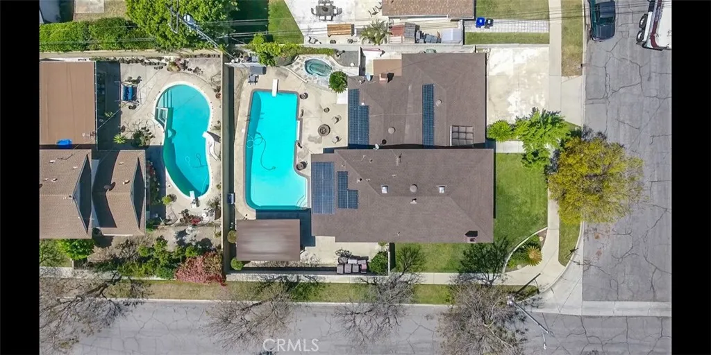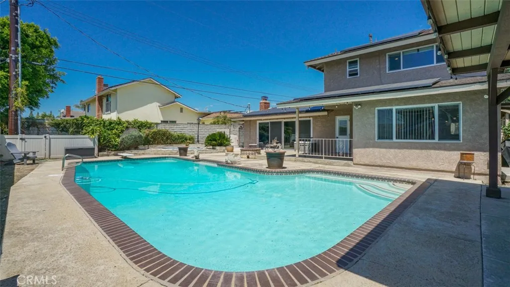 Welcome home to this beautifully remodeled pool home in Upland with PAID OFF Tesla Solar! This 4-bedroom, 3-bathroom impressive pool and spa home is perfectly situated on a tree lined corner lot in an established neighborhood. This move-in-ready gem had been remodeled top to bottom! Step inside to a light-filled, stunning home with tile flooring and recessed lighting throughout, 2 fireplaces, a striking custom stairway that adds a designer touch. The chefs kitchen flows effortlessly into the living and dining areas, ideal for entertaining. The kitchen boasts double peninsulas, counter seating with additional storage, custom counter with a unique textured design, beautiful cabinets with an abundance of space, a dual temperature wine refrigerator and upgraded stainless steel appliances and 2 ovens. Enjoy the convenience of an indoor laundry room tucked away behind custom pockets doors including a counter top and cabinetry for additional storage, plus the efficiency of a tankless water heater and paid off Tesla solar panels, helping you save on energy costs. Step outside through one of 3 sliding glass doors to your private backyard oasis featuring a refreshing pool and spa, covered patio and a gas fire pit perfect for relaxing or hosting friends and family. One of the standout features is the custom designed downstairs bathroom, complete with a unique vanity and walk-in shower, offering direct access to the pool, a must-have for entertaining and everyday use. Don't miss the oversized living area with an expansive wall of glass doors overlooking the pool, built in lighted cabin