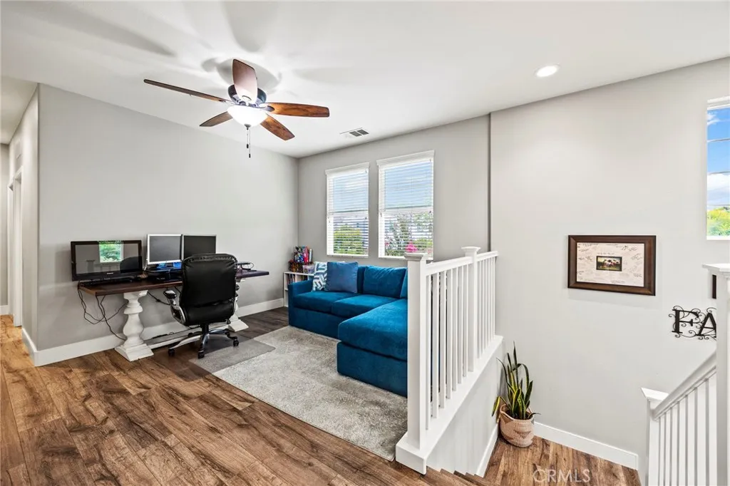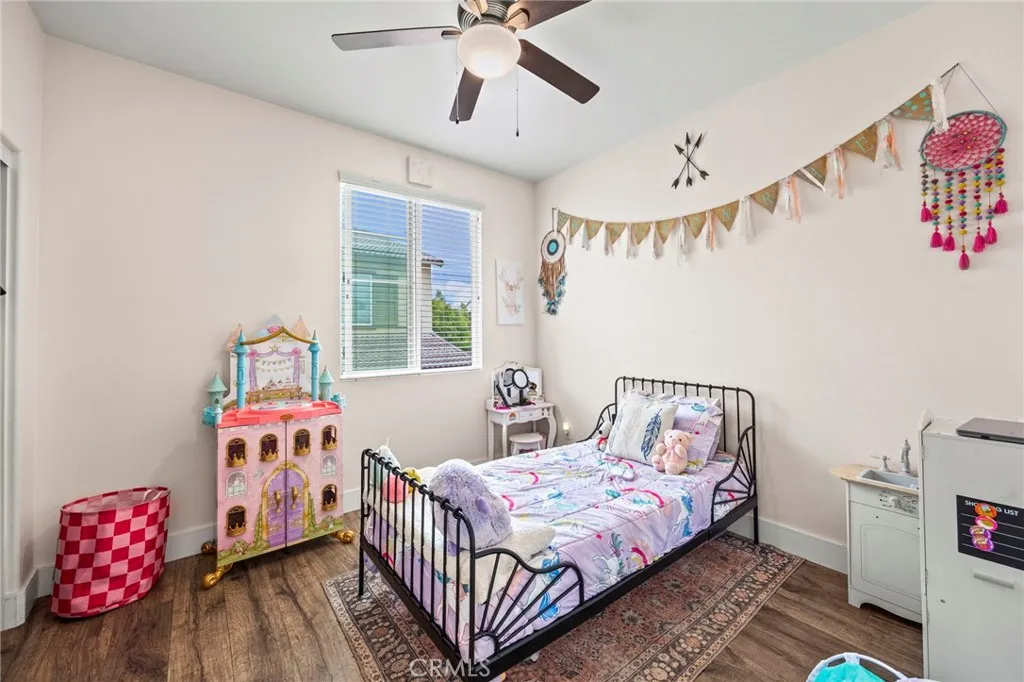 Welcome to this stunning 5 bedroom, 3 bath home nestled in the highly desirable Chino Preserve community. This light-filled, open-plan residence features vaulted ceilings and wood plank tile flooring throughout the main level. The gourmet kitchen is a chef's delight, boasting sleek granite countertops, stainless steel appliances, a sprawling bar style countertop and a walk-in pantry. A custom wood-paneled accent wall with built-in shelving flanks the cozy fireplace in living room, creating an elegant focal point. A versatile bedroom downstairs is perfect for guests, a home office or multi-generational living, while the upstairs laundry room adds daily convenience. Retreat to the generous master suite, complete with a private balcony, scenic views and a massive walk-in closet with custom shelving. Situated next door to a tranquil greenbelt park and just minutes from new schools and a recently developed shopping center. As part of the Preserve community, you'll also have access to resort style amenities including pools, tennis courts, parks, clubhouse and much more.