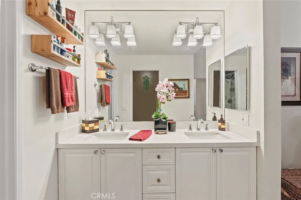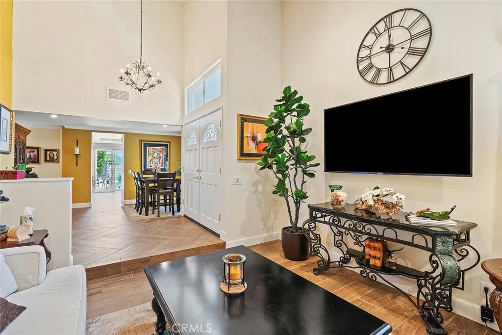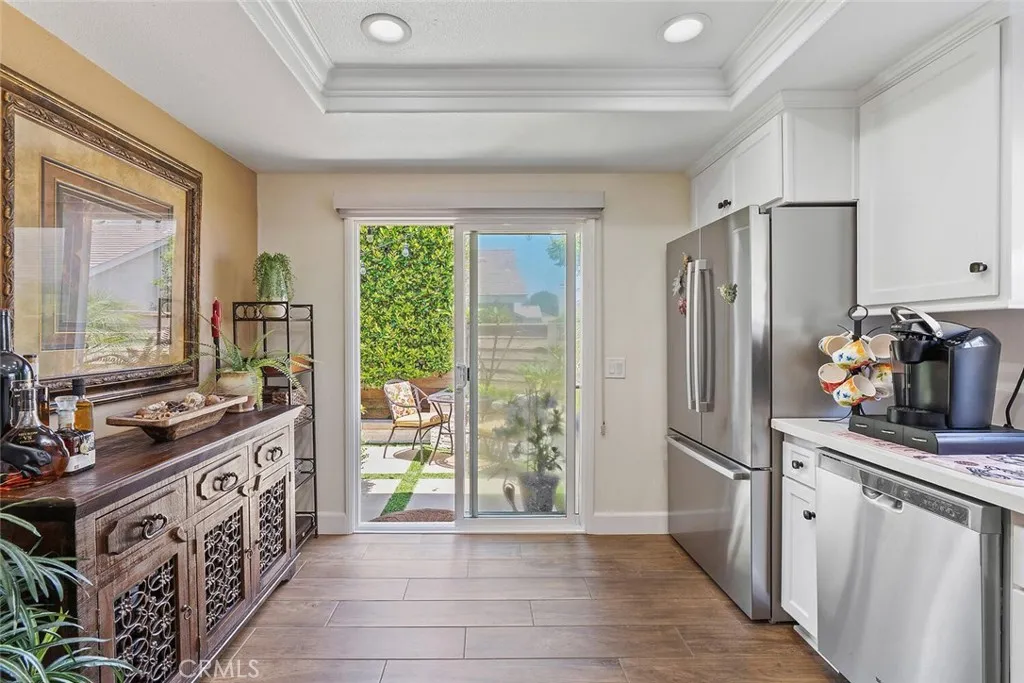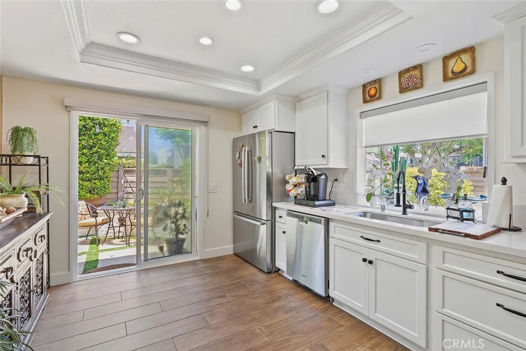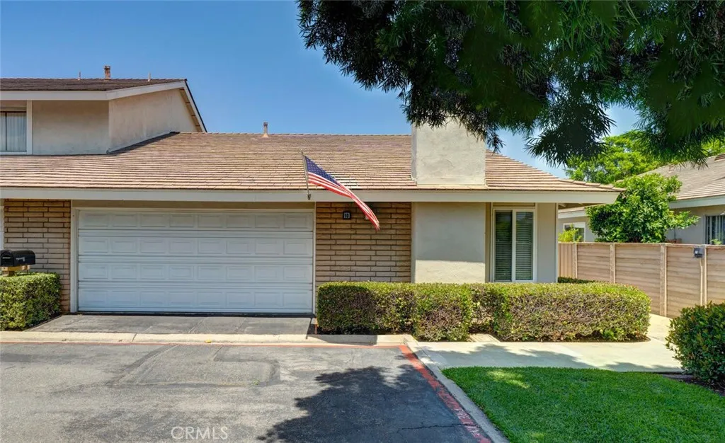 Welcome to 10 Glenhurst! This beautifully updated single-story end-unit is located in the highly desirable Woodbridge community. With an open floor plan, this home features 2 spacious bedrooms, 2 full bathrooms, and a convenient 2-car direct-access garage. A charming double door entry opens to a welcoming foyer featuring porcelain matte wood-look flooring laid in an elegant herringbone design, setting the tone for the stylish updates found throughout the home. The flooring continues through the main living areas, offering durability and modern appeal, while the bedrooms are finished with new plush carpet for added comfort. The living room is bright and airy, enhanced by vaulted ceilings and a tile-accented fireplace that adds warmth and charm. The separate dining area flows seamlessly into the kitchen, which includes updated stainless steel appliances, beautiful new countertops, and recessed lighting. A sliding glass door leads to the spacious patio with newly redesigned combination of concrete hardscape and softscape featuring artificial turf and natural stone wrapped planters filled with trees and shrubs to create an outdoor space that strikes as the perfect balance between greenery and function. Whether you're hosting friends, dining al fresco, or simply relaxing under the sun, this inviting and private patio offers an ideal setting for both entertaining and everyday enjoyment. The remodeled primary suite features a walk-in closet, dual quartz vanities, and a walk-in shower. The secondary bedroom includes mirrored closet doors. The remodeled hallway bathroom offers a soa