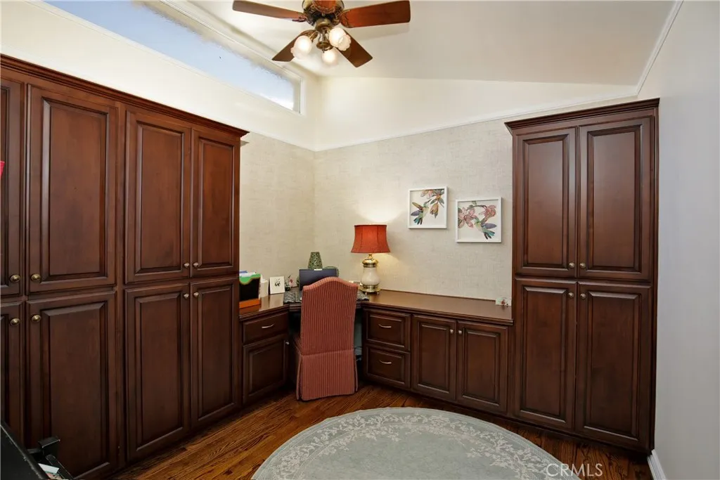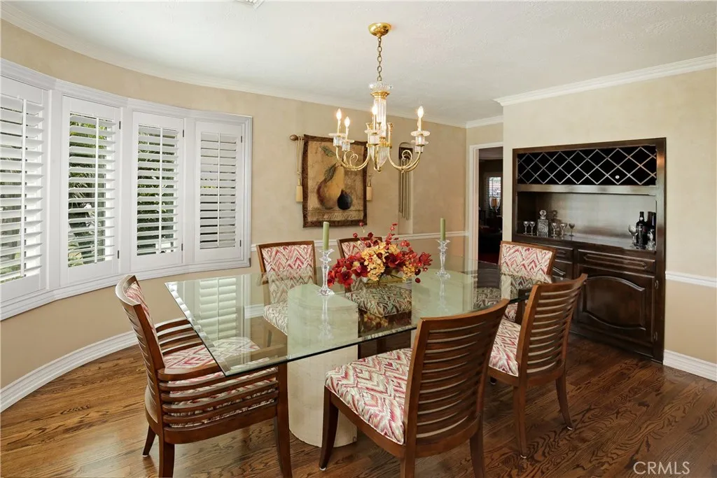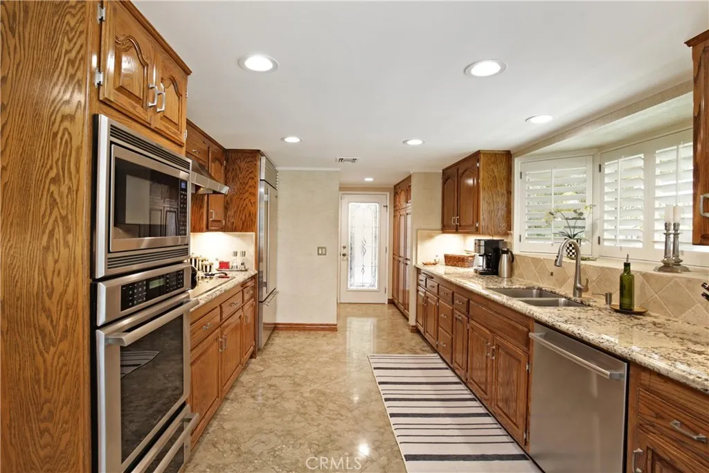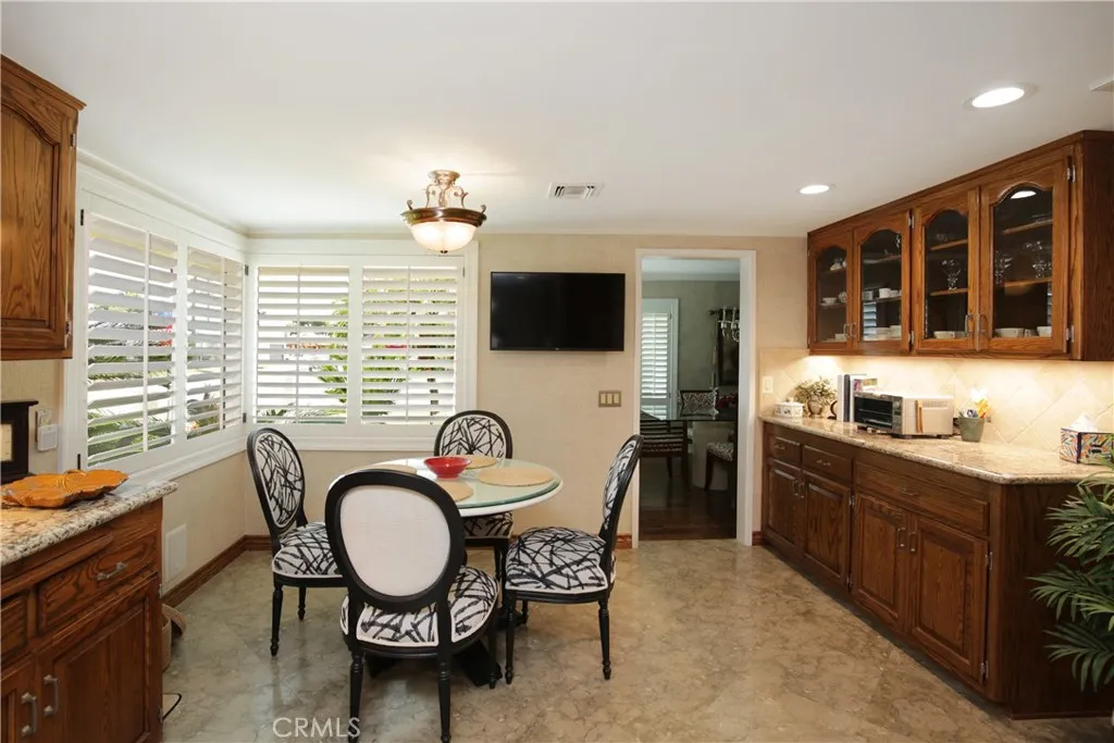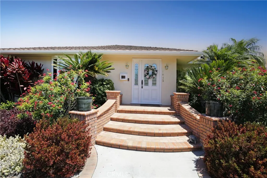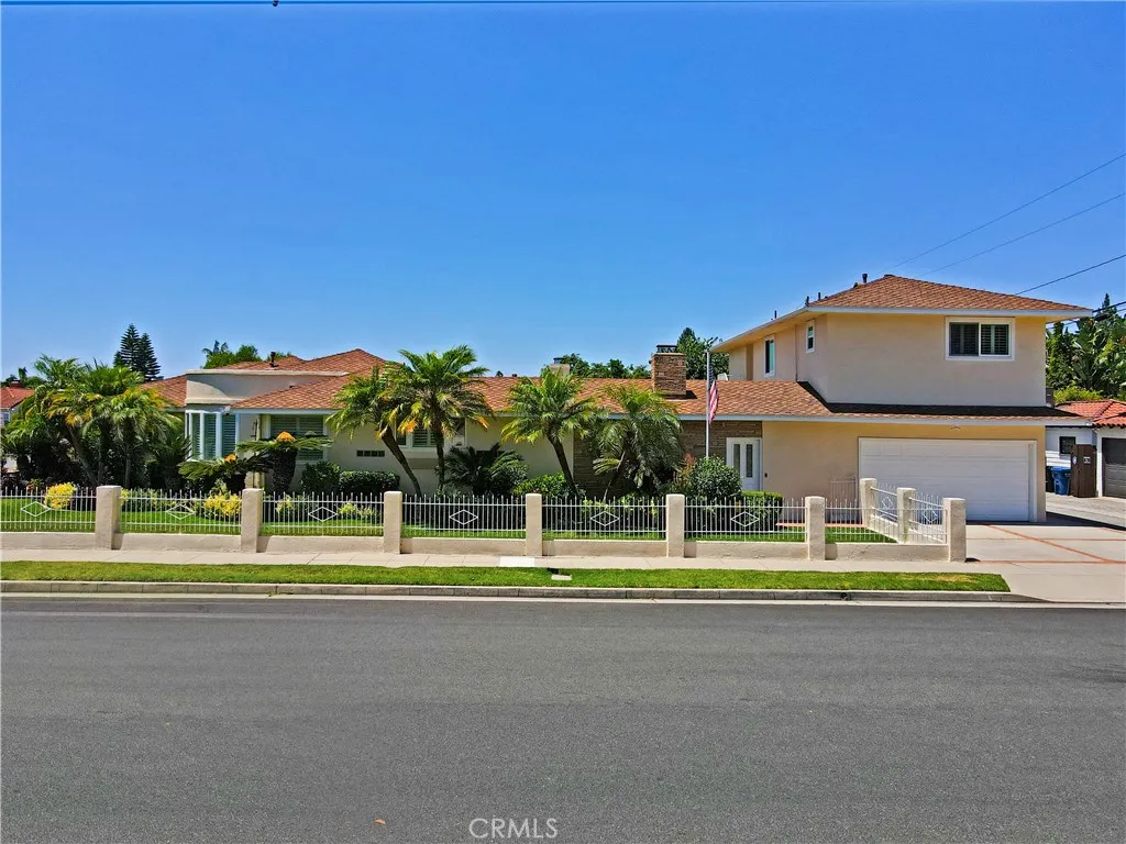 Meticulously maintained and manicured custom home in desirable Orange Estates including a beautiful 1 bedroom unit over 4 car garage. This lovely corner home is move in ready! Large formal entry opens to spacious living room with custom wet bar area. Wood shutters adorn the bay window, the ceiling has a unique design, combined with a glass brick wall and wood flooring. Formal dining room has a built-in wet bar with wine area, bow window. Gourmet kitchen has built in refrigerator, microwave, and double ovens and granite counters and beautiful tile floors. Cozy family room has gas burning fireplace. Remodeled baths and spacious bedroom. One bedroom is currently used as an office with built in desk and cabinets. This home has tons of custom cabinetry and closets for optimal storage. Beautiful covered breezeway leads to outside laundry and garage. Above the 4 car garage is a spacious 1 bedroom unit with living room and kitchen which is approximately 600 sq. ft. It has central air and heat.. Adjacent to the unit is a large storage area ( approximately 200 sq.ft.). This space can be utilized as a 2nd bedroom for the upstairs unit! Manicured rear yard has synthetic grass for easy maintenance. Additional amenities include central air, and security system. Don't miss this opportunity to make this home yours!