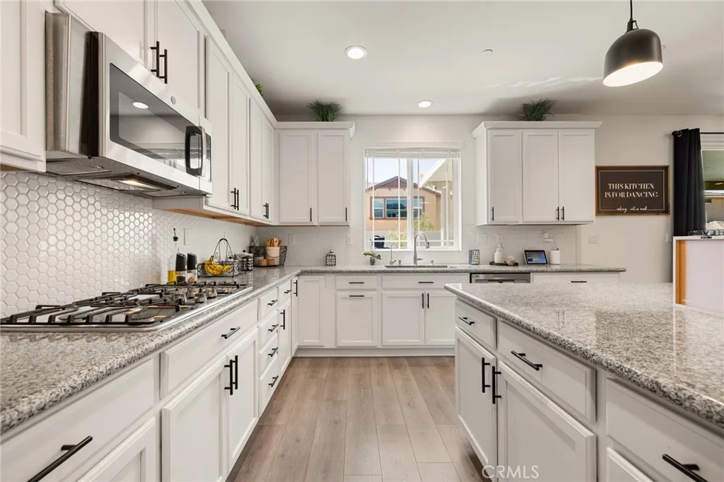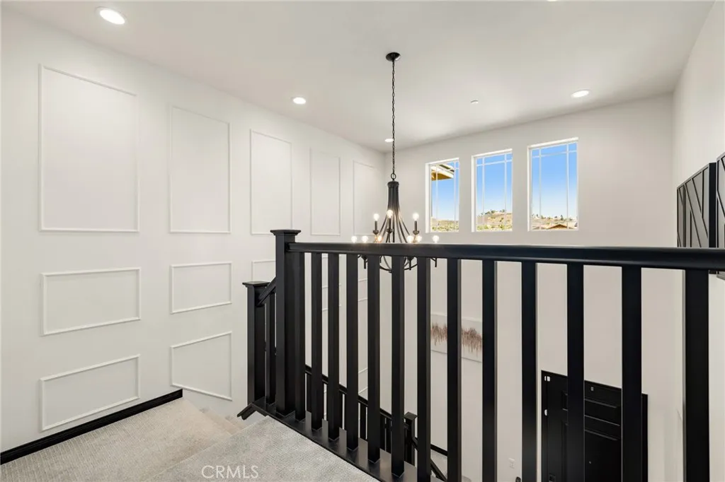 When it comes to modern living this is the one! With upgrades galore, 6 bedrooms, 4 bathrooms, OWNED solar, and an above ground spa, this home literally has it all! The 2021 built Richmond American home features white and black finishes, on a cul-de-sac and is located in the highly desirable community of Audie Murphy Ranch in Menifee, within feet of the new Kathryn Newport middle school. The front curb appeal offers drought tolerant landscaping, and a cozy porch with stunning mountain views. Inside the home you are greeted by soaring 30 foot ceilings, LVP floors and a desirable floor-plan offering 2 main floor bedrooms. The first bedroom is appointed with upgraded carpet, a black wood accent wall and offers a full bathroom boasting a single vanity, and shower-tub combo. Across the hall is a large, long room that offers three built-in desk spaces and custom built-in cabinets, which is perfect for an office or flex space! The two car garage offers EV charging capability and the whole house filtration system and water softener. The large Great Room offers the most beautiful custom electric fireplace in a black shiplap inset surrounded by custom cabinets. The dining area is large enough for a huge farm table and flows into the chefs kitchen. This space is appointed with granite counters, an eat-up island, honeycomb backsplash, black pendant lighting, stainless steel appliances including a new dishwasher, double oven, 5 burner stove, RO water filtration system, and walk-in pantry. The grand staircase features a custom black chandelier, wood accent wall and upgraded carpet. The s