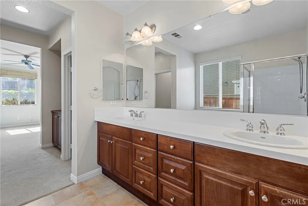 Welcome to this sought-after single-story Spanish-style home in the highly desirable community of Harveston! From the moment you arrive, the charming arched windows across the front hint at the warmth and character found inside. Step into a bright, open floor plan designed for both comfort and functionality, with two spacious secondary bedrooms and a full bath conveniently located at the front of the home, while the private primary suite rests quietly at the back. The heart of the home is the expansive kitchen, boasting a large center island, loads of cabinetry, granite counters, and a walk-in pantryperfect for the chef or entertainer. It seamlessly connects to the dining and living areas, making it an ideal space for gatherings of any size. Sliding patio doors lead you to the low-maintenance backyard, complete with a concrete patio, raised planting beds, mature shrubs, and palm trees, offering a tranquil space to relax, garden, or enjoy outdoor dining. Retreat to the oversized primary bedroom, featuring a ceiling fan, massive walk-in closet with mirrored French door, a spa-like soaker tub, dual sinks with extended counter space, and additional cabinetry for linens and storage. Elegant touches such as crown molding, shutters, and blinds add timeless character throughout the home, while the dedicated laundry room with cabinetry provides everyday convenience. The attached two-car garage offers additional storage and functionality. All of this is set within the incredible Harveston community, known for its picturesque 17-acre lake with walking trails, fishing, paddle boats, an