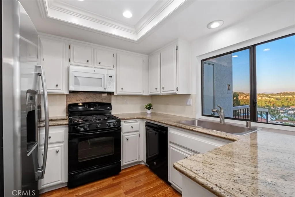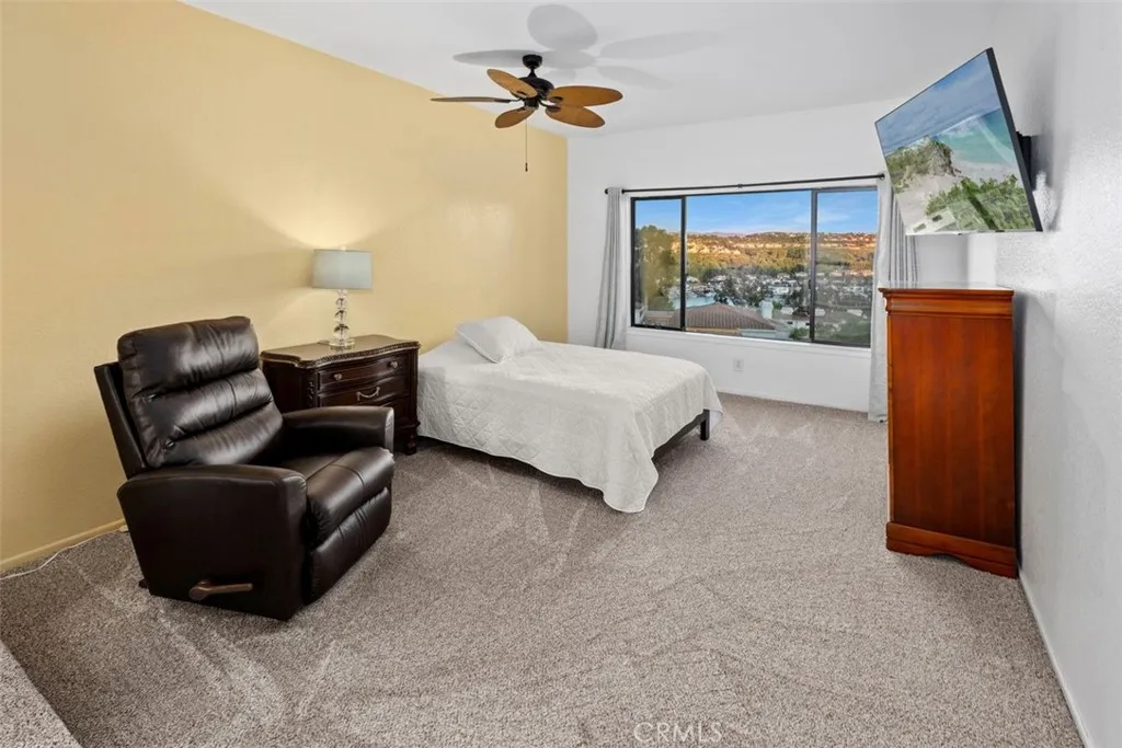 With majestic VIEWS of Lake Mission Viejo and the Saddleback Mountains, this rare upper-level penthouse offers one of the most breathtaking views in the entire community. Nearly every roomliving, dining, primary bedroom, and kitchenshowcases the views. This 2-bedroom, 2-bath home is ideal for a buyer looking for a solid floor plan they can personalize and make their own. The bones are great and while you can change almost anything inside, the views will always remain. West-facing and filled with natural light, the home welcomes you with a calm, breezy vibe from the moment you walk in. The spacious balcony is covered for year-round enjoyment and features two retractable awnings, giving you the flexibility of full sun or relaxing in the shade. Whether you're reading during a rainy day or hosting friends, this space delivers. Next summer, youll have a front-row seat to the SPECTACULAR firework show from your own balcony. You'll also hear the summer concerts as you BBQ and entertain. Inside, the living room features newer carpet (installed less than two weeks ago) a cozy gas fireplace and a newer large sliding glass door to the balcony. Another double-pane sliding glass door in the dining room making indoor-outdoor entertaining easy. The kitchen is clean and functional, with a large window framing that incredible view. The primary bedroom is generously sized and also faces the lakewake up each day to a view that never gets old. The second bedroom is set toward the front of the home and includes a ceiling fan and closet. Ideal for a home office or yoga room. The hallway offers p