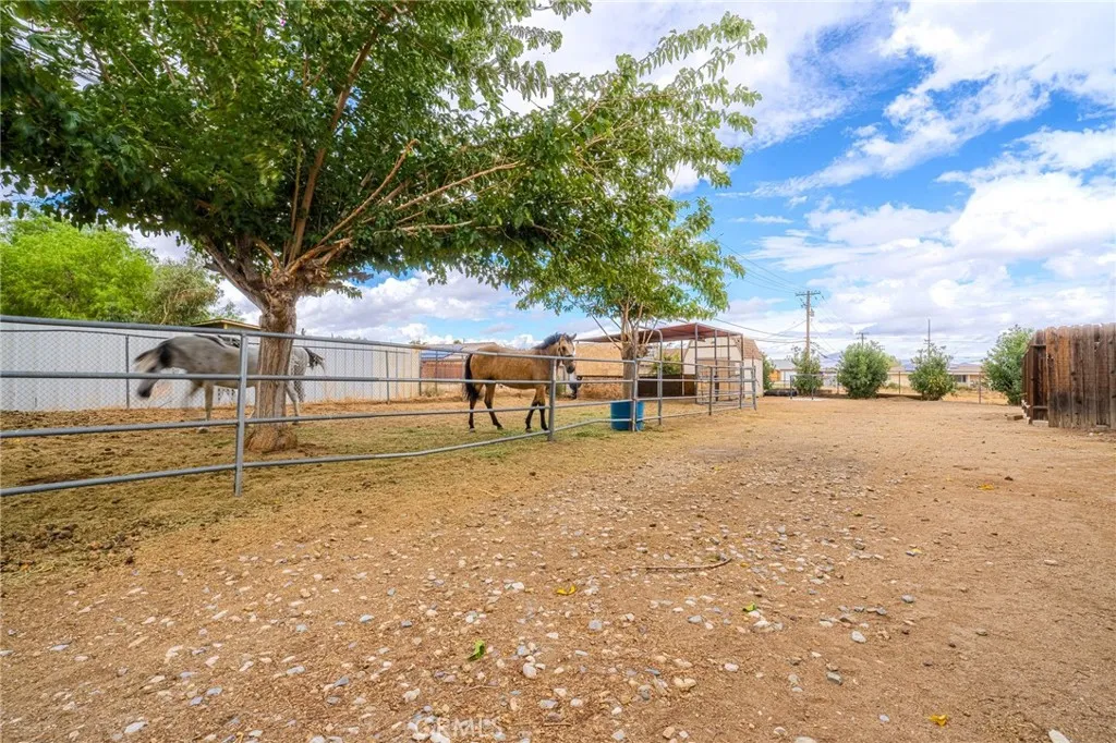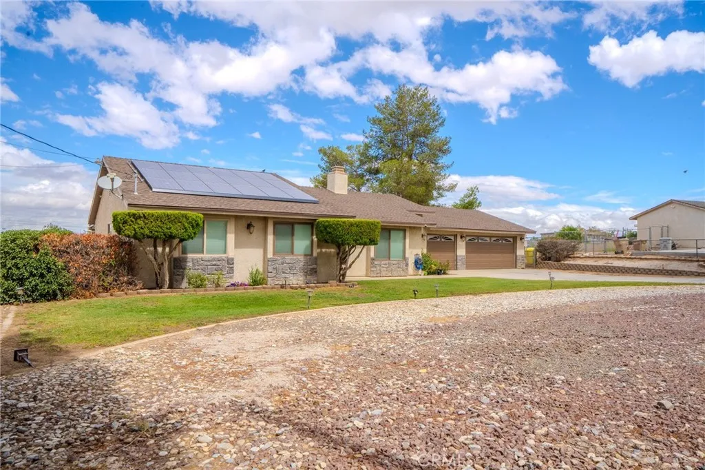 Welcome to this charming single-story home in Hesperia, set on a spacious .65 acre horse property lot. The property is fully fenced with wrought iron and block wall, surrounded by mature shade trees, lush landscaping, and features leased solar panels to help you save for years to come, all paired with a convenient 3-car garage. Step inside and youll immediately notice the tall ceilings and open layout. The home offers a large living room with a double-sided fireplace, a cozy family room, a formal dining area, and a spacious kitchen with tile counters, stainless steel dishwasher and stove, recessed lighting, and multiple skylights for natural brightness. Theres also a breakfast nook with bay windows, an indoor laundry room with storage, and a guest-friendly half bath. The bedrooms are generously sized, each with ceiling fans, while the primary suite boasts direct access through a sliding glass door to the huge covered patio, perfect for enjoying desert sunsets, morning coffee, or weekend BBQs. The backyard features plenty of room to entertain all year long. This home checks all the boxes and wont last long in todays market. Dont wait, make it yours before its gone!