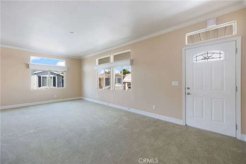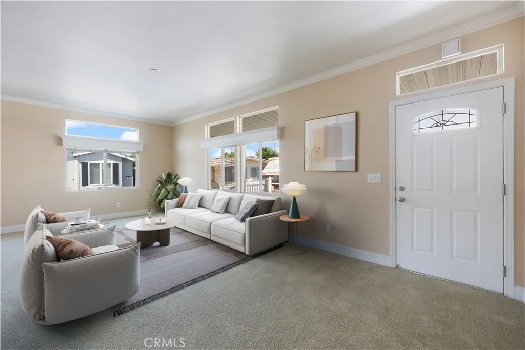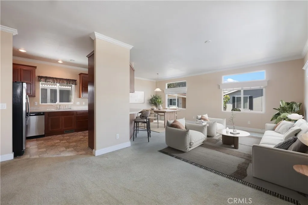 Back on Market due to logistical issues for the buyer's relocation from out of state to CA. Whittier Downs is a 55+ gated community designed for residents who value connection, creativity, and comfort. The home is nestled on Cypress street and is a lovely 2 bedroom/2-bathroom home which also comes with a bonus room that can serve as an office, guest bedroom, meditative sanctuary or hobby/craft room. This mobile home is on a solid foundation and feels like a sturdy, traditional home with 9-foot, smooth ceilings, drywall textured walls, recessed lighting in the kitchen and ample storage throughout. The neutral palette of light tan showcases the architectural accents of gleaming white crown molding, 5-inch routed baseboards and mahogany colored cabinetry in the kitchen & bathroom. The paneled interior doors with lever hardware further enhances the feel of a higher-end traditional home and makes accessibility to rooms easier and more user friendly. Plush, low-cut camel colored wall to wall carpeting is soft and warm under foot and has never been stepped on by cat or dog paws. It has been freshly shampooed for you so please feel free to kick off your shoes! The kitchen is punctuated by satin finished stainless steel appliances with a black enamel & stainless 4-burner gas range and deep stainless-steel sinks with sprayer. The interior living area is flooded with natural light and multiple functional windows for cross breezes, and the primary bedroom has subdued lighting for better rest, sleep and relaxation. The ensuite primary bathroom is spacious, has a walk-in shower and ample