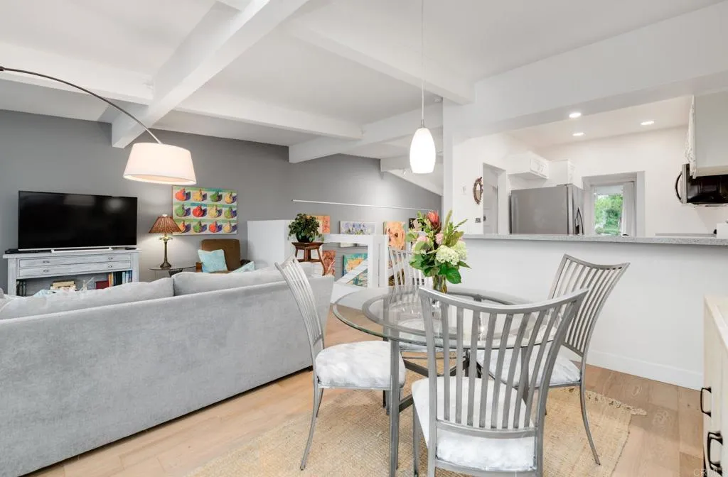 Don't miss out on this gorgeous tri-level end-unit townhome with rare dual views! Convenient location. Ocean sunsets from the upper-level balcony at the back and tranquil garden views from the front. This is the only condo in the development with both front and back views, and with only one shared wall it offers exceptional privacy. The home features two balconies, one off the primary bedroom and a spacious balcony on the top floor that extends the living area and is perfect for relaxing or entertaining. The upper living level showcases vaulted, beamed ceilings and over-sized picture windows facing east and west, filling the space with natural light and refreshing sea breezes, while the garden patio off the second bedroom provides a peaceful shaded retreat. The home has been extensively upgraded, including all new Anlin windows and sliding doors, covered by a double lifetime transferable warranty. The upper level has Bravada Contempo hardwood flooring and new baseboards, while the middle level features Oasis El Capitan water-resistant laminate flooring and new baseboards, and all stairs have been updated with Gulistan Hawthorne stain-resistant carpeting. The hall bathroom has been fully renovated with a custom tile and glass shower, new vanity, sink, mirror, and fixtures. Four new wall heating units service individual zones in the living room, dining area, and both bedrooms. Parking is convenient with a two-car garage plus additional space for two cars in the driveway. This home is superbly located, close to the ocean, great shopping and dining, and just minutes from the La