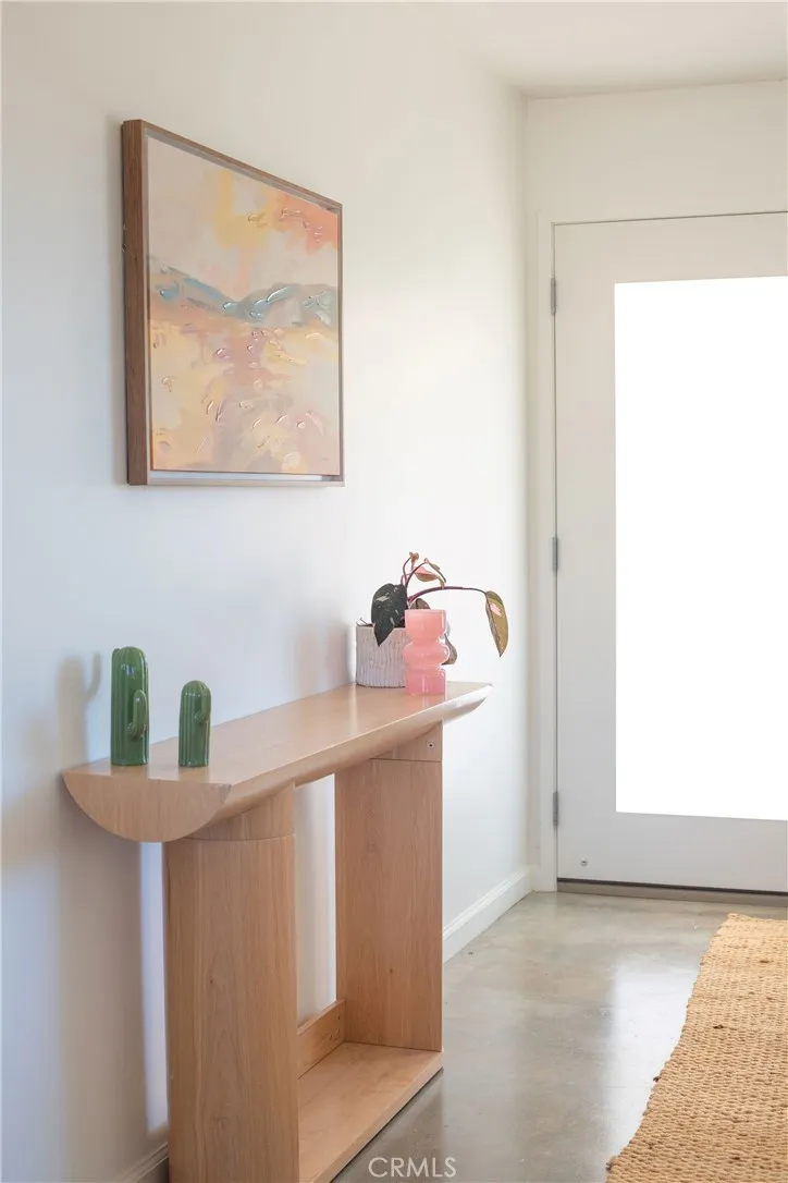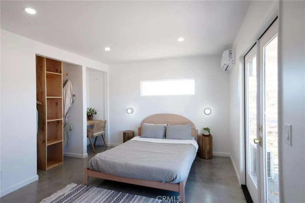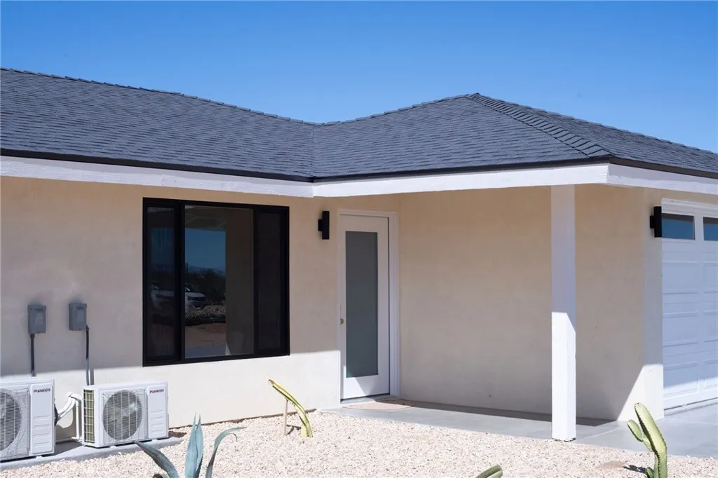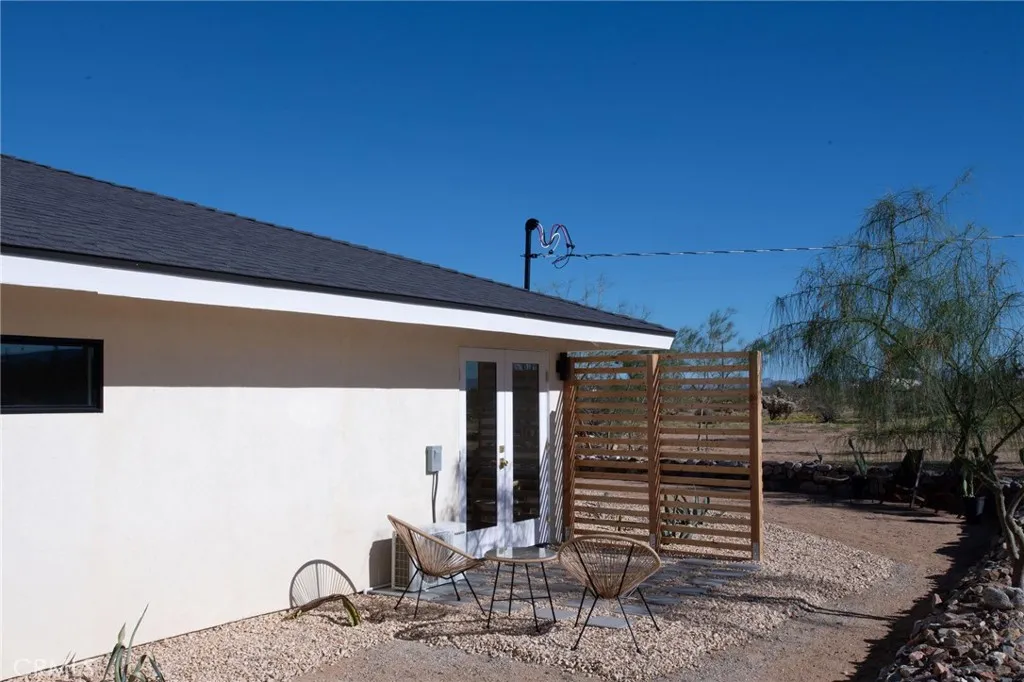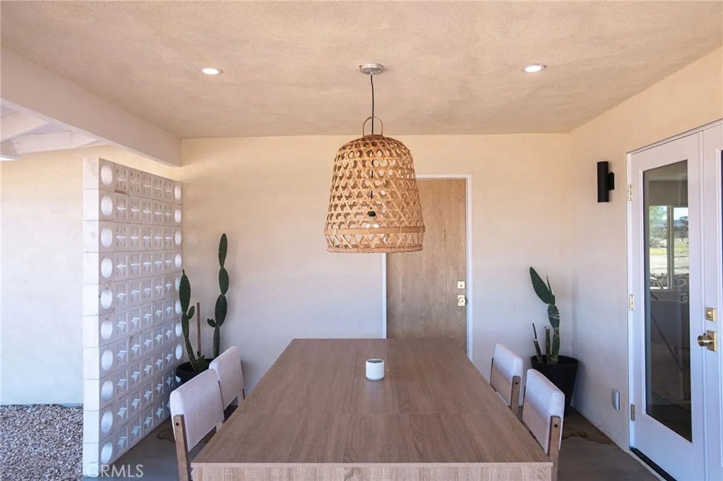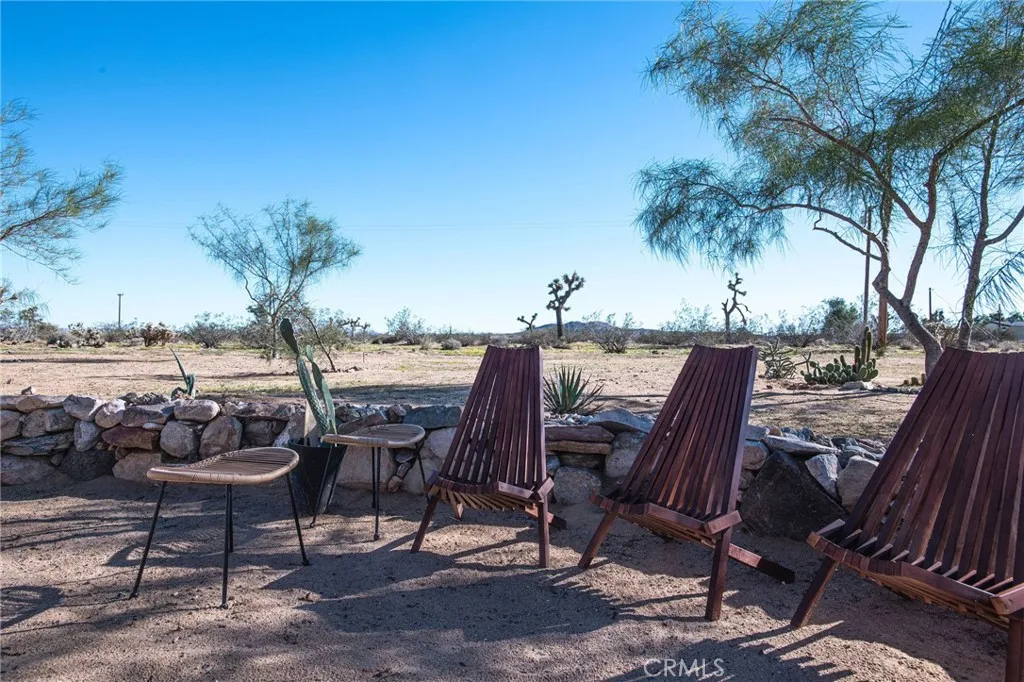 Welcome to 59676 Mitch Rd, where Bohemian Flair meets Desert Elegance. This gorgeous turn-key property has been completely remodeled with every feature intentionally chosen to bring you the perfect airbnb, desert home or weekend retreat. This house showcases 3 bedrooms, 2 bathrooms and 5 ACRES OF LAND with stunning panoramic desert & mountain views. Inside you'll find sleek concrete floors, tasteful decor & furnishings, rounded archways, recessed lighting and large windows that let in an abundance of natural light. The warm and welcoming living room flows effortlessly into the awe-inspiring kitchen and dining area complete with designer-style tile backsplash, bright quartz countertops, beautiful modern cabinetry, high-end FORNO appliances and bar seating. Each bedroom is well appointed with mini-splits for year-round comfortability, closets with custom built-in shelving and 2 of the 3 bedrooms adorn french doors that lead to their own private outdoor patios. Both bathrooms boast spa-like showers with sophisticated tile, glass panels and lovely new vanities with clean, modern finishes. The finished garage has been transformed into the ultimate hangout space equipped with a bar, wine fridge, sink, additional cabinetry, a mini-split and a cozy elevated lounge area (there is even a stacked washer/dryer for added functionality). It doesn't stop there; the serene outdoor living space includes a lovely covered patio for outdoor dining, an outdoor shower with a rainfall shower-head, ample space to entertain or relax around a firepit on a starlit summer night. Not to mention, there