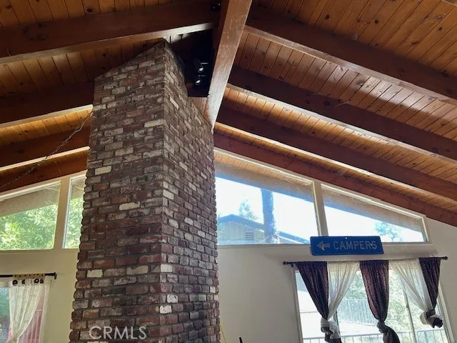This charming home features level entry and stunning cathedral wood ceilings, offering 3 bedrooms and 2 baths, plus a 2-car garage with a large workshop and extra parking. Fresh interior paint and new carpet make it move-in ready. The main level has two bedrooms and a 3/4 bath, one with its own outdoor access. Upstairs, youll find two primary bedrooms with a full bath. The property includes RV or boat parking, a spacious laundry room, and a walk-in pantry. The upper floor boasts tall knotty pine ceilings throughout the bedrooms and expansive living room, a roomy kitchen with ample cabinets and counter space, and a formal dining area opening to a patio. Enjoy the floor-to-ceiling brick fireplace, a wraparound front deck, and a concrete rear patio perfect for play. With solid good bones, air conditioning, and forced air heating, this commuter-friendly home is just minutes from schools, Lake Gregory recreation, fishing, and hiking. Experience a peaceful mountain lifestyle with four seasons, away from city noise and traffic, in a private neighborhood set back from the main road.