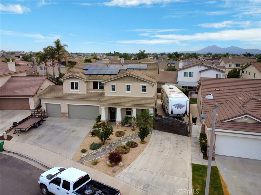 ***Huge price reduction***Rare find! This property checks all the boxes! Extra-large RV parking for all your toys 14-20ft wide X 47ft long! OR space for future add on or ADU. PAID OFF SOLAR!!! 8000-watt solar system with IQ7 micro inverters. This 4-bedroom 3 bath home is at the end of a cul-de-sac with a 3-car garage. Low maintenance front yard is Drought resistant DG with dry rock riverbed. Enter the home to the large open great room with soring ceilings and lots of windows for all the natural lighting. Mini bar or coffee bar adjoining Great room and kitchen. Large family kitchen with island, granite countertops, lots of cabinets, stainless steel appliances, breakfast bar, large pantry and an area for table. Kitchen is open to good size family room with cozy fireplace. Downstairs offers a bedroom and bathroom with walk in shower. Also included downstairs is the laundry room with wash basin and extra linen cabinets. Upstairs you will find 3 additional bedrooms, linen cabinets and an open loft with ceiling fan that could be made into a spacious office or bedroom. Master bedroom suite with double door entry and sitting area with ceiling fan. Master bathroom offers dual sinks, vanity, walk in closet, oversized soaking tub, and sep shower. 2 additional good size bedrooms. FUN backyard that offers space for all your entertaining! You will find a swimming pool and relaxing spa, built in bbq with sink, aluminum patio cover and blue glass fire pit. In addition to RV parking there is a large side yard with a shed. 3 car garage with rollup doors and lots of storage cabinets. Vinyl fl