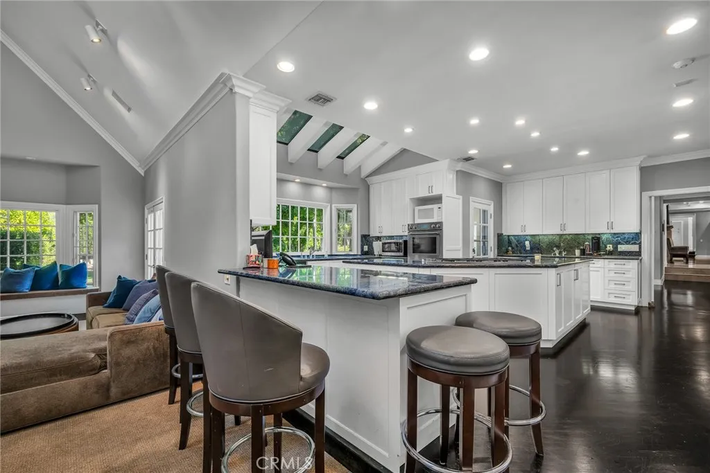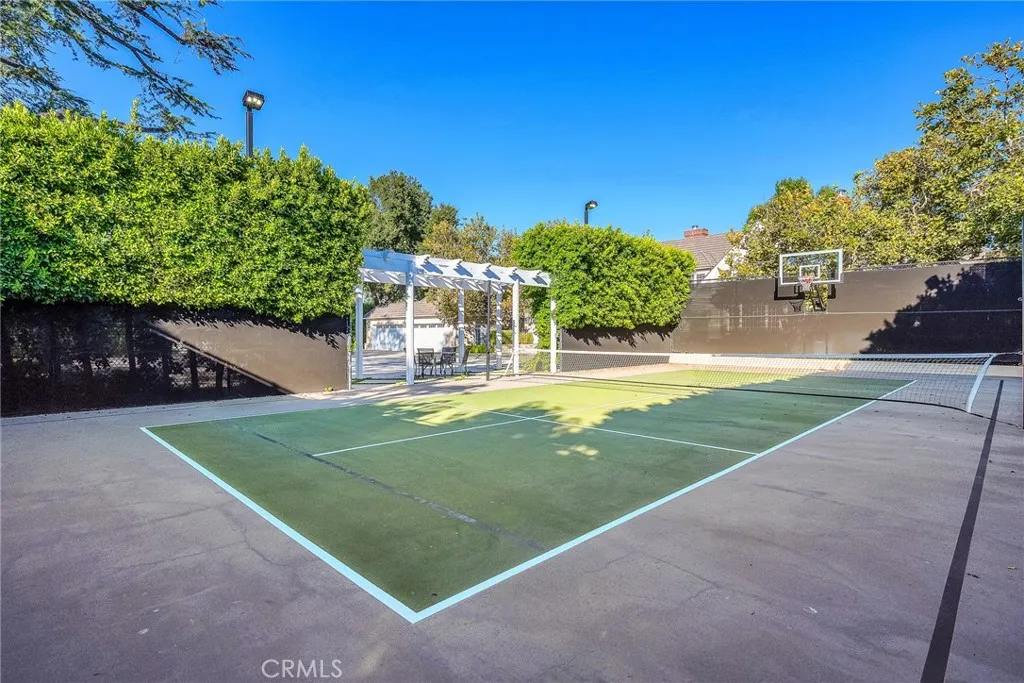 Welcome to this stunning south-of-the-boulevard gated estate, sitting on over one flat acre in the heart of Encino. As the dramatic gates open, youre greeted by a 30-car cobblestone motor court that sets the tone for this 9,200 sq. ft. residence. To the south, youll find a lit sports court striped for pickleball the perfect spot for daily matches and weekend fun. The front-facing four-car garage offers abundant storage space, attic access, and is prepped for EV charging. Step through the grand glass entry doors into an entertainers dream home, designed for large gatherings, holidays, and unforgettable parties. The main level offers a huge sunken dining room, a warm and cozy library, a formal living room, and a lively bar room all opening to the backyard for a seamless indoor-outdoor experience. The chefs kitchen boasts soaring ceilings, top-of-the-line stainless steel appliances, two sub-zero refrigerators and freezers paneled to match the kitchen, and a connected family room, perfect for homework, game nights, and casual hangouts. The laundry area leads to a home office, full bathroom, and guest quarters, ideal for long-term visitors or staff accommodations. The 1,600 sq. ft. primary suite is a retreat in itself, with high-pitched ceilings, a separate sitting room or gym/nursery, a spa-like bathroom with a sunken tub, and a spacious walk-in closet. Just outside the suite is a 1,300-bottle temperature-controlled wine room, accessible from both inside and outside the home. Upstairs, a dramatic staircase leads to three generous secondary bedrooms, each with an en-suite bath
