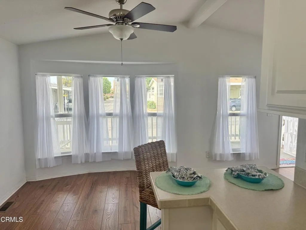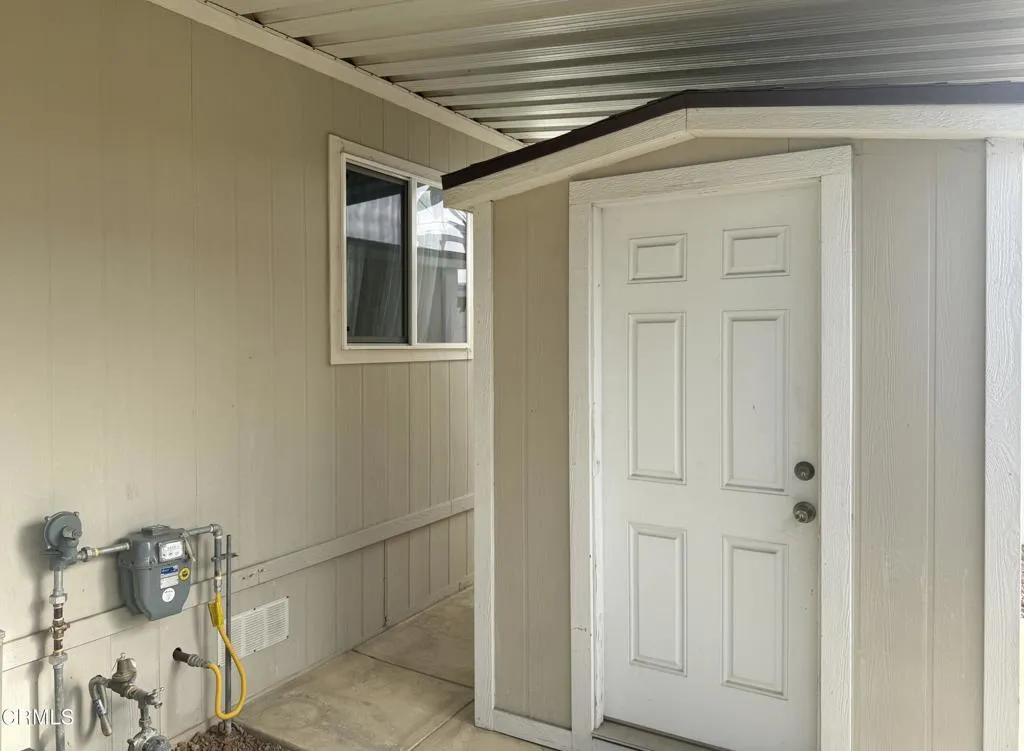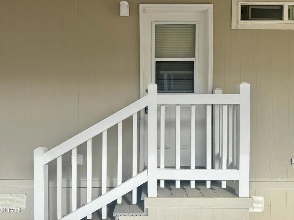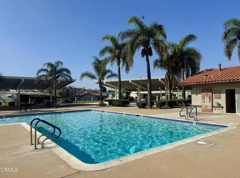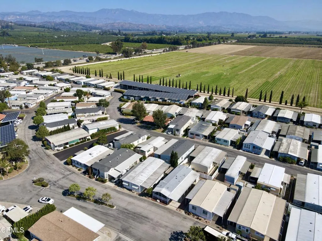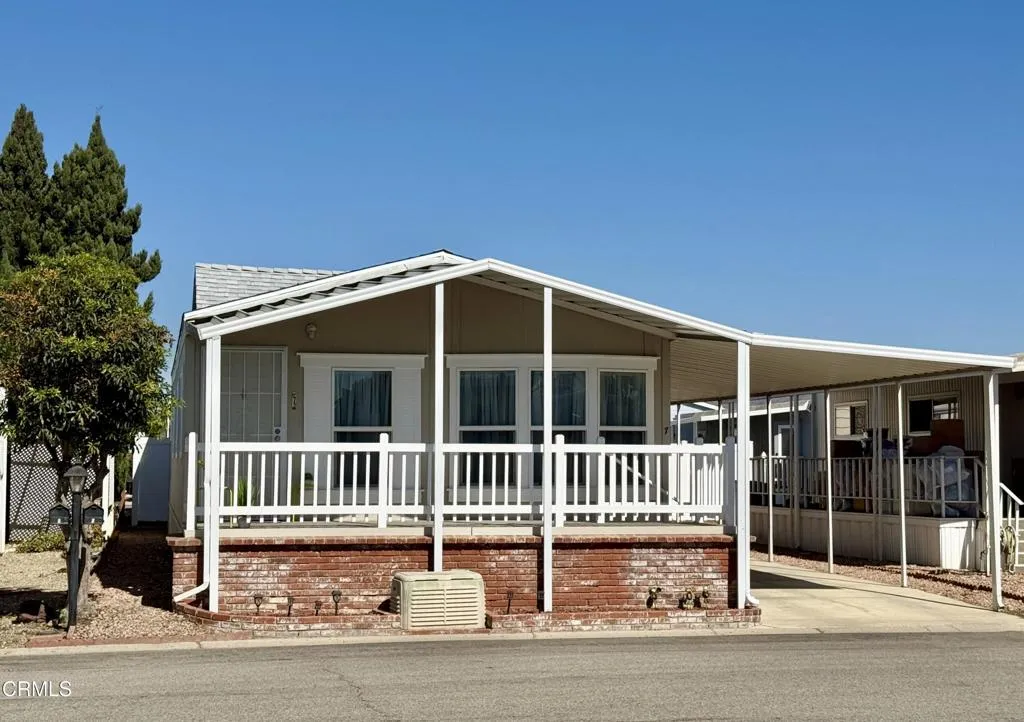 Welcome to 7 Wisteria Way, a well-maintained manufactured home featuring a new Certainteed Landmark Solaris Cool Roof (installed July 2025) and a fantastic location within a desirable age-restricted community. Natural light streams through well-placed windows, highlighting the airy living spaces and easy-care hard-surface flooring throughout (with plush carpet in the bedrooms). The primary suite includes a spacious closet and en suite bath with abundant storage and an easily-accessible shower. The hall bath has a shower and tub combination. Keep cool with ceiling fans in both bedrooms, the family room and the dining area. The light kitchen opens to the dining area with a cute counter for possible seating or serving too. Enjoy the inviting shady front porch with beautiful used brick detail--perfect for relaxing with a book, entertaining or connecting with neighbors in this vibrant, active community. A large storage shed with shelving offers added convenience, while the extended carport can accommodate longer vehicles or two cars parked tandem. Thoughtfully appointed, this is a wonderful place to call home! The community itself has a sparkling pool surrounded by a grassy lawn, palm trees, picnic tables, and courts for shuffle ball and corn hole. There is a covered hot tub as well as an event space. East Ventura combines the quiet atmosphere of agricultural fields mingled with residential neighborhoods including parks and schools. Trailheads at Harmon Canyon to area hiking are found off of Foothill Road. Multiple golf courses are nearby. For dining, shopping and entertainment,