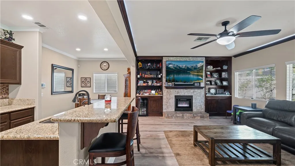 Beautifully Upgraded Home in Prime Wildomar Location! Located near Elsinore High School, Wildomar Library, shopping, and freeway access, this 3-bedroom, 2.5-bath home offers comfort, style, and convenience. Features include LED lighting with crown molding, upgraded laminate flooring, new carpet upstairs, and a custom master closet. The open living area includes a built-in shelf and an electric fireplace with the original gas connection still available. Enjoy the extended patio cover, BBQ area (included), and hot tub hookup, perfect for entertaining. The property also offers cemented RV parking with a 50-amp hookup. Energy-efficient solar with 24 panels, keeps bills low. Additional upgrades include baseboards, ceiling fans throughout, and added lighting in each room. Dont miss this well-maintained home with amazing upgrades inside and out!