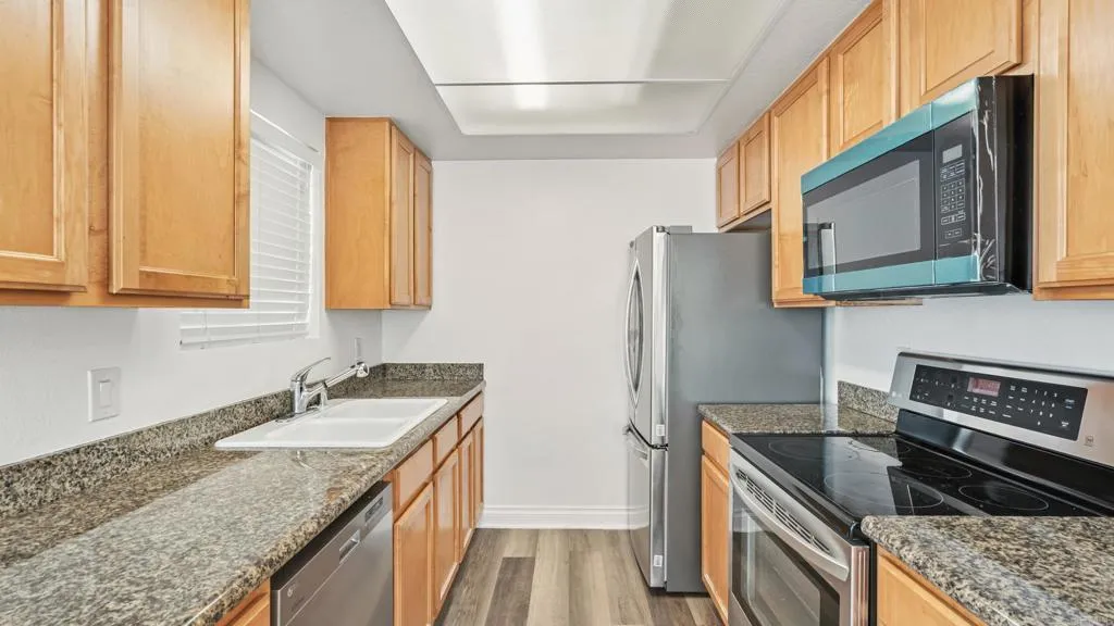 !VA Approved! Welcome to your new home in the secure, gated community of Palm Court in El Cajon! This thoughtfully updated 1-bedroom, 1-bath upper-level unit offers the perfect blend of comfort, style, and low-maintenance living with your own private staircase up to the unit! Privacy all the way! Step inside and discover a bright and inviting space featuring tasteful finishes, luxury vinyl plank flooring, and stylish ceiling fans. The cozy living room is perfect for relaxing evenings, complete with a charming fireplace, while the updated kitchen shines with elegant granite counters and new appliances! This home is a true gem, offering a rare HOA permit for an in-unit washer and dryer, making laundry day a breeze. You'll also have an assigned carport parking space. Beyond your front door, the Palm Court community provides a wealth of amenities to enhance your lifestyle. Take a dip in the sparkling pool, unwind in the soothing jacuzzi, or stay active in the fitness center. The complex is fully gated and secure, with lush, pristine landscaping and a convenient community laundry room. Ideally situated, you'll be within walking distance to a variety of restaurants and shopping options, with easy access to freeways for a quick commute.