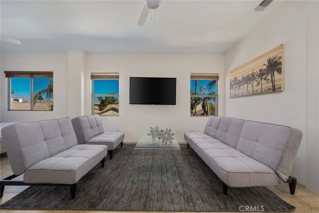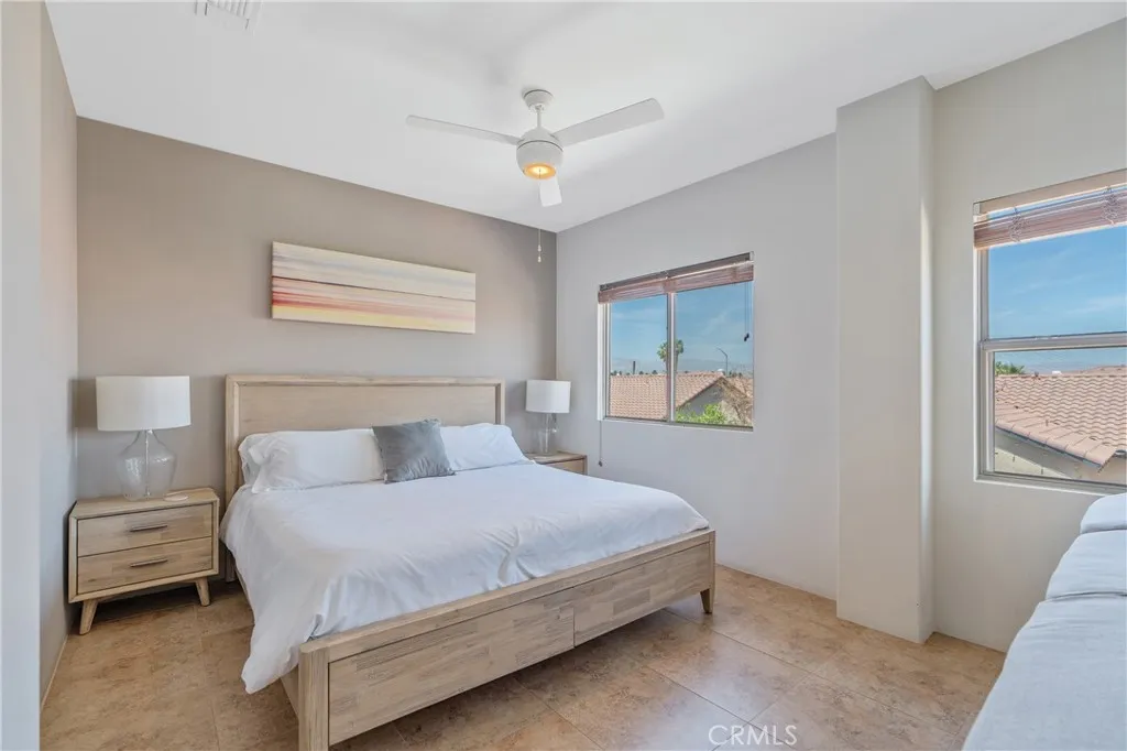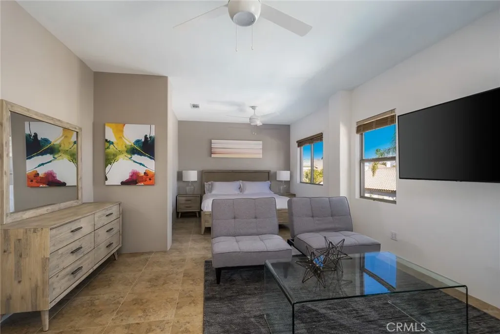 Best priced turn key home is located in the highly desirable Rincon community, with NO HOA! Short term rental potential! Walking distance to the polo fields where Coachella, Stage Coach amongst other festivals are held! This 4bed /3bath home boasts almost 2,600 sq ft of entertainment space and was professionally designed for the ultimate Palm Springs experience. Enter the double doors into an impressive foyer with soaring high ceilings, modern sputnik chandelier and an accent wall that is sure to leave a lasting impression! Other features of the first level include spacious living room, open concept kitchen, family room with a fireplace and patio doors that lead to your very own backyard oasis! There is the first of 4 bedrooms on the first level as well as a bathroom, and direct access to the generous 3 car garage, as well as laundry area. Upper level includes the spacious primary suite, plus an additional 2 bedrooms and 1 bathroom. The backyard is something out of a resort - offering a beautiful pool / spa, as well as several outdoor seating areas! Other highlights include newer oven and refrigerator, automated jandy pool pump, yale smart lock and nest thermostat, must see!