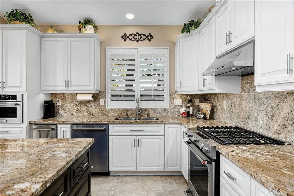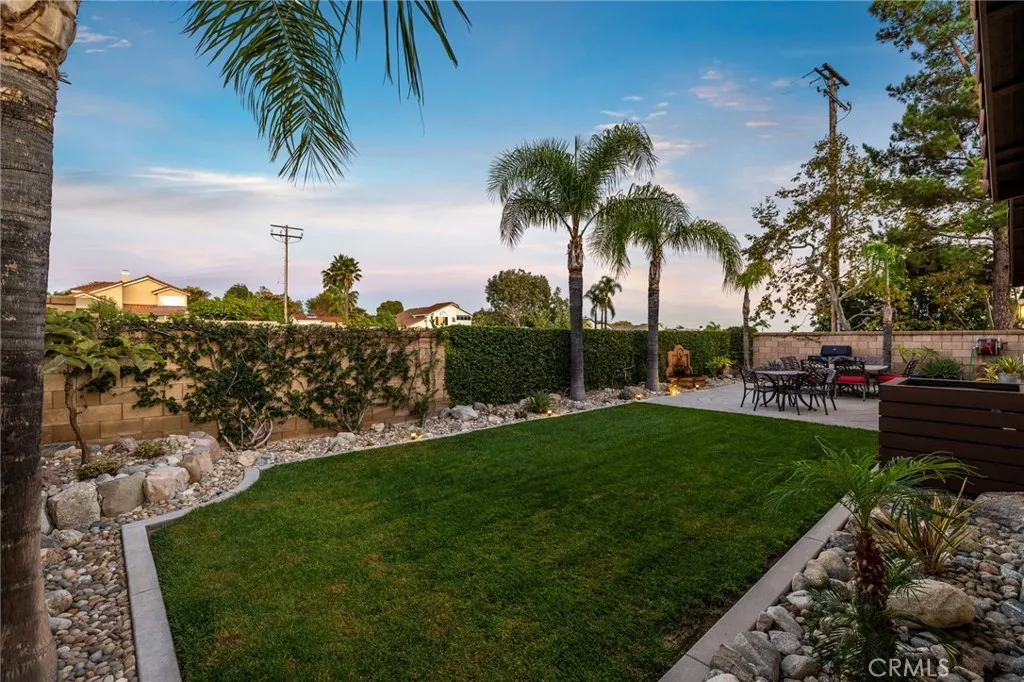 Completely Remodeled Single-Story in The Colonies | Private Cul-de-Sac Location with Mountain Views. Located at the end of a quiet cul-de-sac in the highly sought-after Colonies community, this beautifully remodeled single-story home offers privacy, panoramic mountain views, and elevated finishes throughout. With no rear neighbors, manicured landscaping, and a thoughtfully designed floor plan, this property delivers both comfort and sophistication. The front yard features a lush lawn, mature hedges, illuminated planters, and a covered front porch. Inside, tiled flooring leads you through a welcoming hallway accented by architectural niches, recessed lighting, and crown molding that extends throughout the home. The formal living and dining rooms showcase vaulted ceilings, a wall of windows with plantation shutters, hand-scraped hardwood flooring. The adjacent family room offers hardwood floors, a built-in bar, a custom media wall with tile backsplash, high ceilings, and expansive windows framing mountain views. The remodeled kitchen features custom cabinetry, granite countertops with full granite backsplash, stainless steel KitchenAid appliances, an island with bar seating, a pantry, and a sliding door to the backyard patio. A hallway powder room offers added convenience for guests. The primary suite includes vaulted ceilings, peaceful backyard views, dual walk-in closets with built-in organizers, and a luxurious en-suite bathroom with dual sinks, a frameless glass shower, and a separate soaking tub. Two additional bedrooms complete the layout, one currently set up as a home