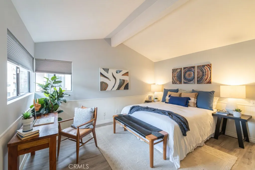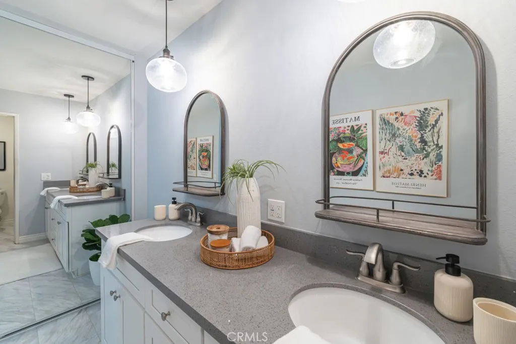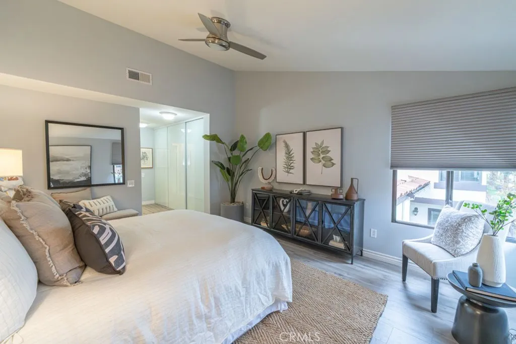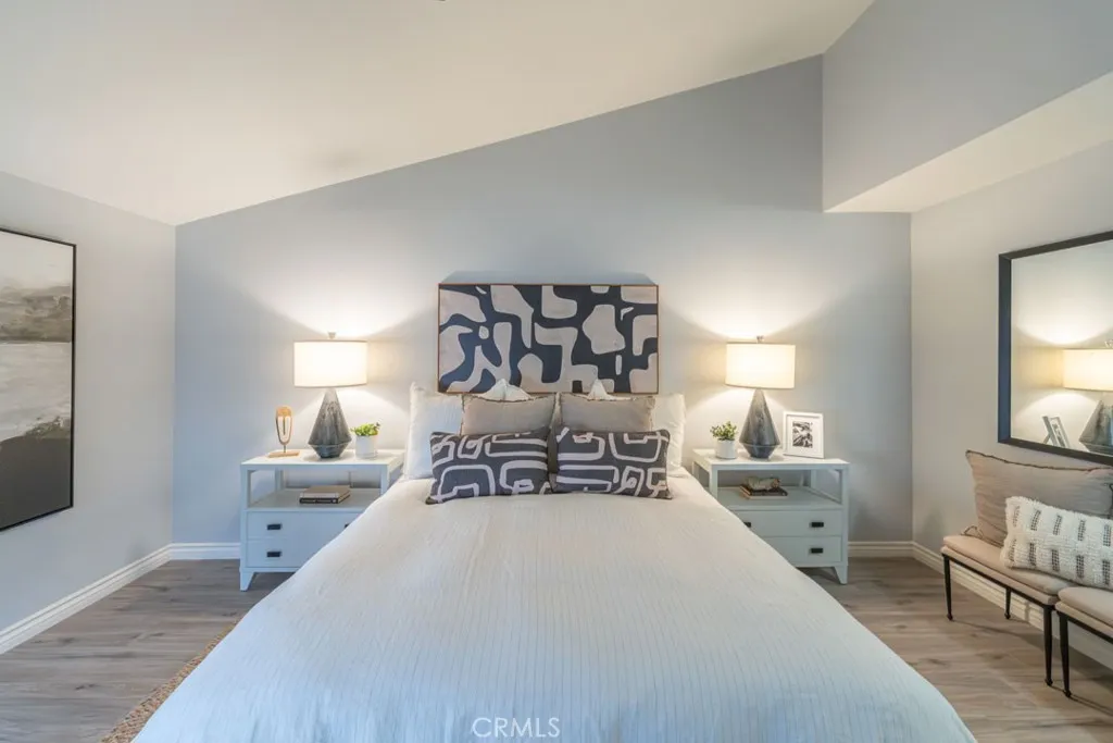 Discover this pristine and tastefully remodeled townhome featuring two spacious primary suites and three bathrooms, located in one of Los Altos best-kept secrets The Fountains. This is truly a special community the perfect find for those seeking the look and feel of a single-family home with the convenience and economy of a townhome. As you enter the gated development, youll immediately notice its beauty, meticulous upkeep, peaceful atmosphere, and the strong sense of pride shared by its residents. Inside, soaring 15-foot ceilings create a rich and comfortable feel. The bright and airy living room features a cozy fireplace and an oversized sliding glass door that opens to a private patio, perfect for relaxing and enjoying blue skies or entertaining guests. The open dining area flows seamlessly into the updated kitchen, which features dual windows overlooking the patio for effortless summer gatherings. Both primary bedrooms boast vaulted ceilings, generous closet space, and their own private bathrooms. The home has been freshly painted throughout and features new bedroom flooring, upgraded lighting fixtures, and modern window coverings in both suites. Additional conveniences include central A/C and heating, along with a direct-access two-car garage offering washer and dryer hookups and ample storage space. Enjoy resort-style living with a newly remodeled pool, two spas, clubhouse, tennis and pickleball court, and beautifully landscaped grounds highlighted by seven tranquil fountains. Ideally located within walking distance to the Los Altos Shopping Center, restaurants, ent