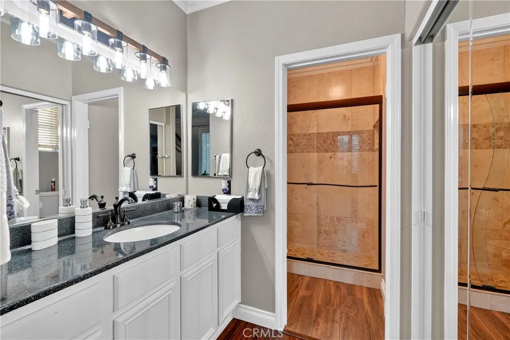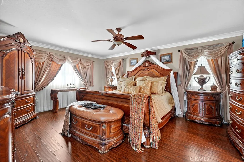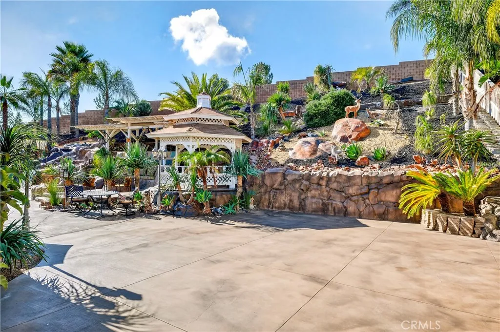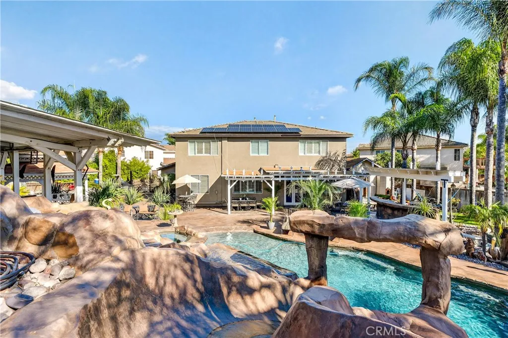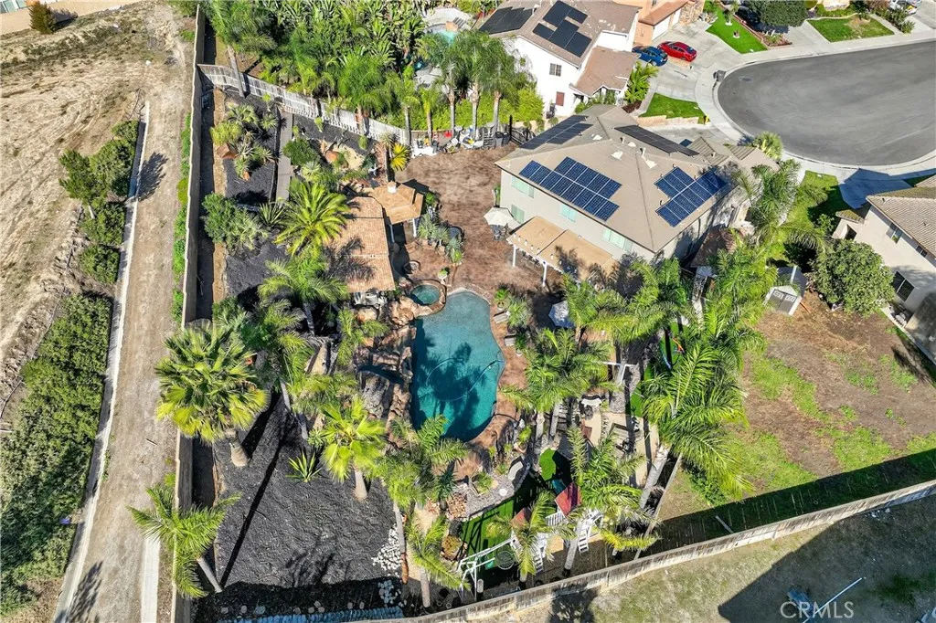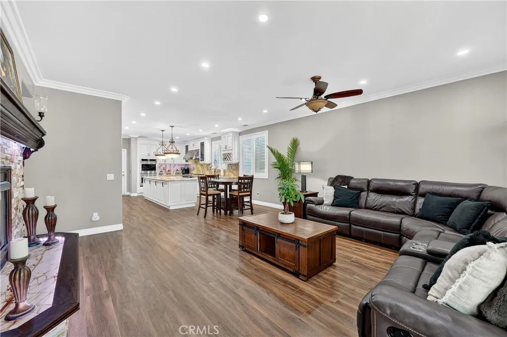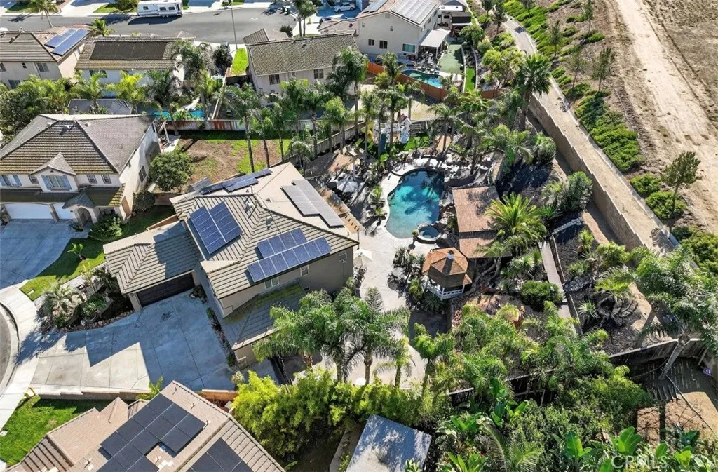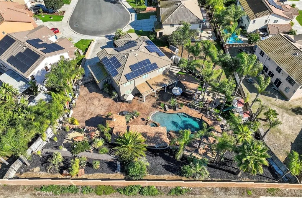 Your dream home awaits! This stunning property truly has it allfeaturing a breathtaking backyard that offers resort-style living at its finest. Enjoy a beach-entry, saltwater pool and spa complete with a waterfall grotto and slide. The expansive larger lot offers 16,000+ sq ft and includes custom stamped concrete, a built-in gas fireplace with a cozy seating area, a beautiful gazebo, and a custom BBQ island with a built-in fridge, sink, pergola, and patio cover. With no rear neighbors and a private cul-de-sac location, the setting is truly unbeatable. Inside, the home is filled with upgrades. A formal living room welcomes you at entry. The layout offers seven bedrooms, or six plus a loftwith two bedrooms conveniently located downstairs. Two of the bedrooms are en-suites with their own private attached baths. The primary suite features double-door entry, a spacious walk-in closet, dual sinks, separate bathtub and walk-in shower. Upgraded restrooms. The gourmet kitchen is a chefs dream with an oversized 10-ft island with pendant lighting, self-closing antique-white cabinetry, commercial-grade stainless steel GE Monogram appliances, 6 burner- 48" stove with griddle. Quartzite counters and backsplash, convectional double wall ovens, convectional built in microwave/toaster oven, and an apron sink. Storage is abundant with a walk in pantry, a built-in wine rack, spice drawer, cutting board, lazy susan, and a hidden cabinet for trash bins. The kitchen opens to the family room with a double-sided fireplace and also offers a separate dining room. Shutters, crown moulding and LVP woo