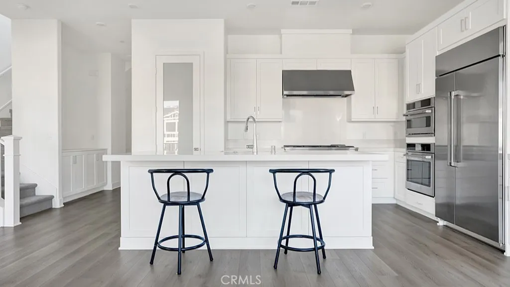 Welcome to 401 Junco, a beautifully crafted new construction residence located in the sought-after Estela community within The Great Park. Ideally situated right across from Luna Park, this stunning three-story home sits on a premium corner lot offering one of the largest front and side yards in the neighborhoodperfect for outdoor living and enjoying views of the park. Upon entry, youre greeted by a spacious and versatile flex room that can serve as a private office, family room, or home gym. This level also includes a half bath and direct access to the front and side yard, creating a seamless indoor-outdoor living experience. The second level features a bright, open-concept floor plan connecting the gourmet kitchen, dining area, and living room. Enjoy cooking and entertaining in the modern chefs kitchen, which showcases stainless steel appliances, a built-in refrigerator, 6-burner cooktop with griddle, built-in oven, and convection oven. A private balcony extends from the living area, while the primary suite with a luxurious en suite bathroom and an additional half bath complete this level. On the third floor, youll find three spacious bedrooms, including one with a private en suite bath, and another full bathroom shared by the remaining two roomsideal for family or guests. Additional features include a spacious two-car garage with extra storage, roller blinds throughout, a full-house solar system, and upgraded finishes in every room. All bathrooms feature tile flooring and quartz countertops, while the main living areas boast luxury vinyl plank floors and plush carpeting