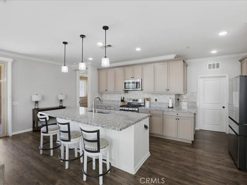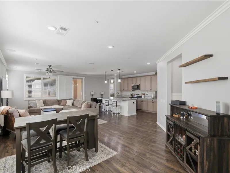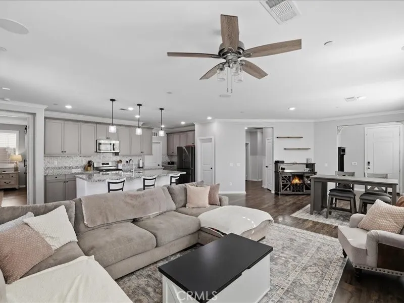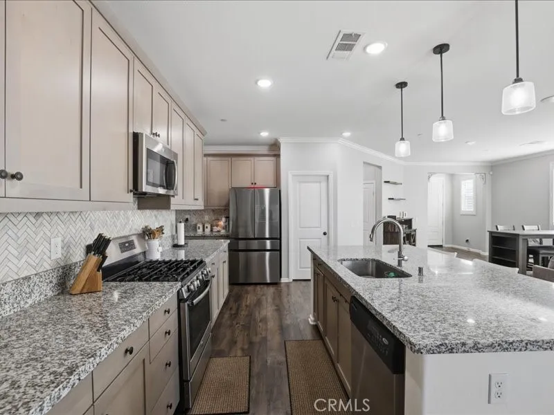 Welcome to this beautifully upgraded home located in the Sundance community of Beaumont. This single-story home features an open-concept layout designed for entertaining and everyday comfort. From the moment you step inside, youll notice the spacious feel and the elegant finishes throughout. The kitchen is a true showstopper! Complete with beautiful granite countertops, custom tile backsplash, a stand-alone island, stainless steel appliances, and a walk-in pantry. The home also includes crown molding, plantation shutters, upgraded baseboards, recessed lighting, and stylish fixtures. Enjoy energy savings year-round with Tesla Solar, offering an eco-friendly and cost-efficient solution. Step into the backyard and prepare to be impressed. Features include artificial turf, an extended concrete covered patio, dog run and a pergola perfect for outdoor dining and relaxing evenings. Inside, the bathrooms have all been tastefully remodeled with white tile countertops, updated flooring, and modern finishes. The hallway bathroom even features a rustic plank accent wall for added charm. The spacious primary suite offers privacy, with secondary bedrooms thoughtfully separated by a hallway. Residents of Sundace can enjoy the community park, playground and Cascade Park with its two pools. You truly have to see it to appreciate it!
