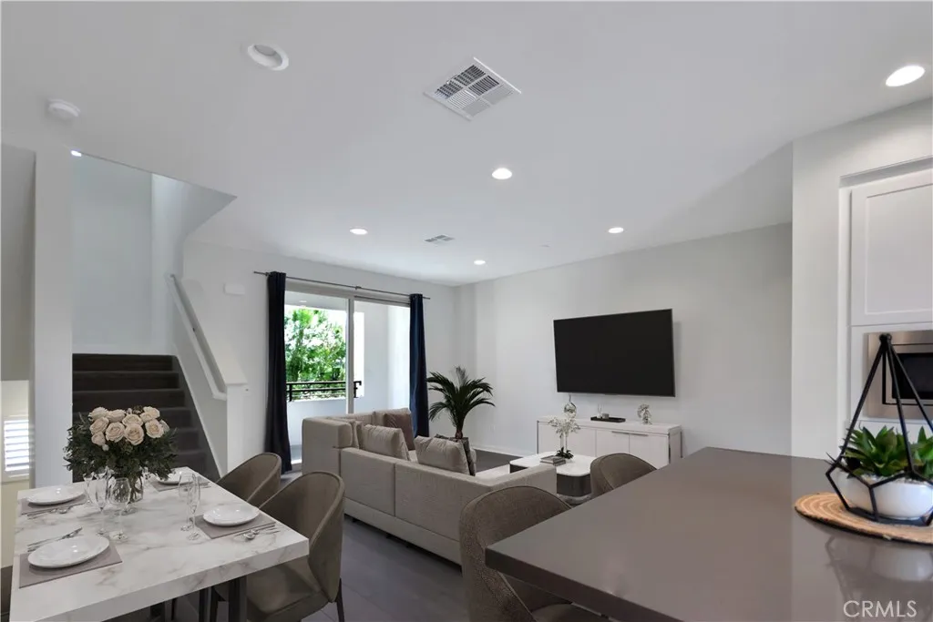 2 bedroom, 2.5 bath with a 2 car (side by side) garage with EV charger in the Novel Park area of the Great Park. This home offers approximately 1,498 sqft of living space and boasts a nice-sized owner's suite with a spacious walk-in closet, dual sink vanity, and a large walk-in shower with subway tile surround and a clear glass shower door. The secondary En Suite has its own private bath with a tub/shower combo. The open floor plan allows a flexible living space on the second floor with the kitchen, a center island bar, a living room, and a private balcony overlooking the greenbelt. The updated kitchen boasts a full decorative backsplash, stainless appliances, and lots of cabinet storage space. The Great Park community has so much to offer and this unit is a short distance to park, pool and two dog parks. It is also conveniently located to shopping, freeways, toll roads, and entertainment.