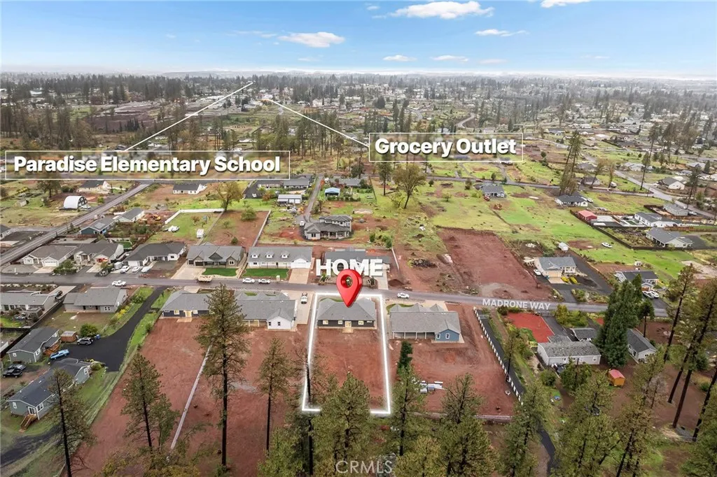 Modern design meets small-town charm here! This beautiful 3-bed, 2-bath home sits on one of Paradises most desirable, newly built streetslined with gorgeous stick-built homes. Gone are the days of wondering what might be built next door; Madrone Way offers peace of mind and a true sense of community. If this home isnt the one, come see what else is available on Madrone! Step inside and youll immediately be greeted by 9 ceilings throughout, with 10 tray ceilings in both the living room and the primary suite. The finishes set this home apart, with the green fireplace serving as an instant showstopper. The open-concept layout is perfect for entertaining, featuring a spacious kitchen with an L-shaped island and plenty of room for barstoolsideal for gatherings and everyday living. This split floor plan places two bedrooms, a full bath, and the laundry room on one side, while the primary suite enjoys its own private retreat on the other. The primary bathroom feels like a spa getaway, showcasing a striking wet room with a tile shower and soaking tub, all enclosed in glass for a sleek, modern touch. From the primary suite and back patio, enjoy beautiful sunsets that fill the sky each evening! Outside, youll love the fully fenced backyard, perfect for pets, play, and privacy. The location is unbeatabletucked on the west side of town with a short drive to beloved Bille Park and easy access to Skyway, making it simple to reach anywhere in Paradise or beyond in minutes. Built by American Dream Construction, a trusted local builder known for quality and craftsmanship, this home includes