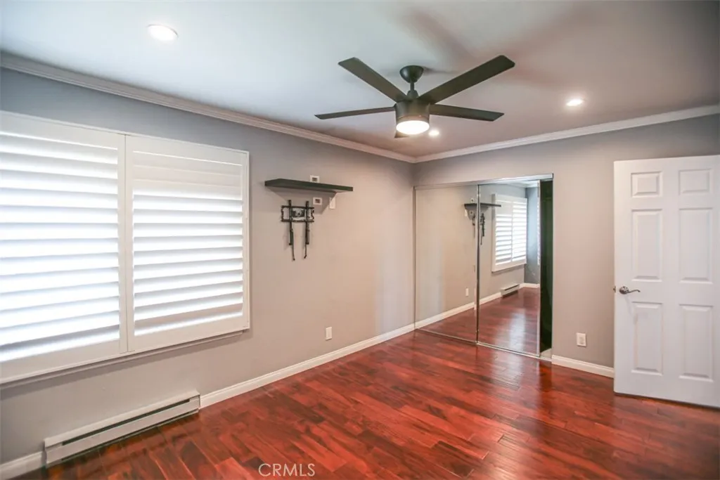 Turnkey Corner unit! Bradford place community Townhome, 3 bedrooms, 1.5 bathrooms, detached 2 car garage. Inside featuring laminate wood floors, plantation shutters, recessed lighting, built in electric fireplace, upgraded dual pane windows. First floor features a half bath, dining area, and remodeled kitchen. Sliding door access to spacious back patio area. All 3 bedrooms upstairs, remodeled bathroom, laminated wood floors. The Bradford Place community offers resort-style amenities, including a sparkling association pool, inviting clubhouse, and a fun-filled kids' playground. Best of all, enjoy the peace of mind and educational excellence of the award-winning Garden Grove Unified School District.