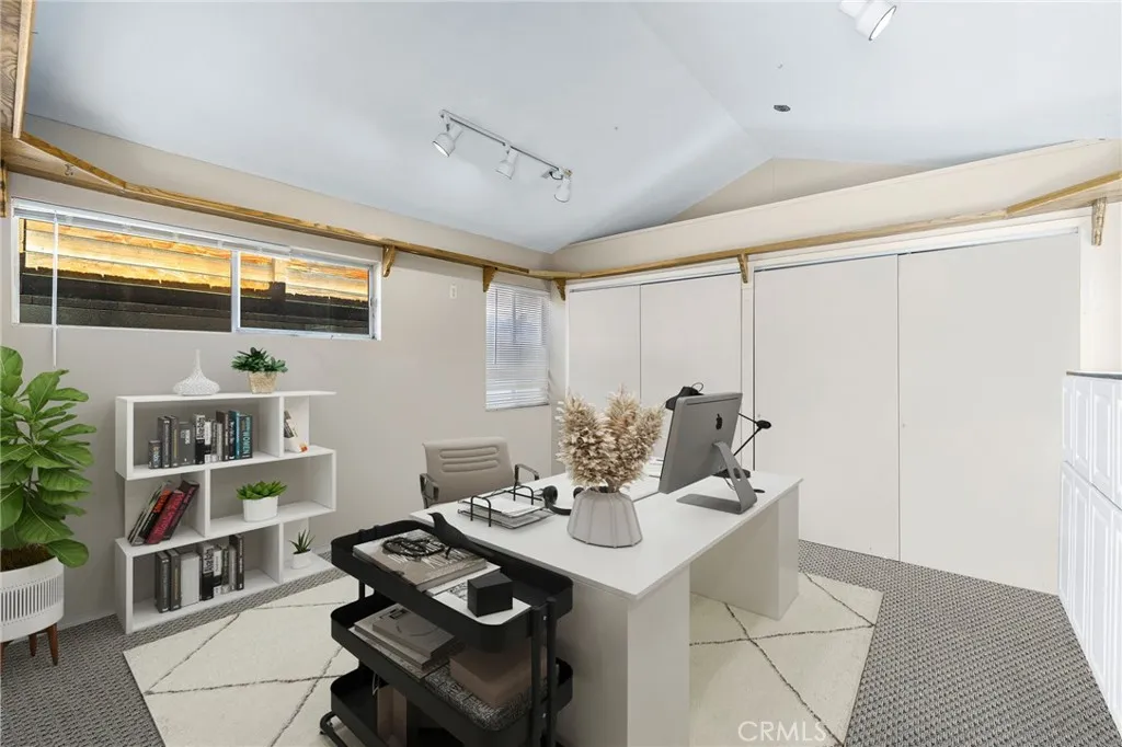 Single-story pool home with a spacious grassy front yard, manicured shade tree and planters, and a gated, covered front courtyard leading to double entry doors. The entryway opens to a generous living room where a wide sliding door forms a glass wall to the backyard and pool and an adjacent dining room off the entry enjoys a picture window to the front yard. The kitchen features classic white cabinetry, tiled floors and countertops, black appliances, and a peninsula and it opens to the family room. The family room offers an arched brick fireplace and a second slider to the patio and backyard. Down the hall, the primary bedroom offers a ceiling fan, its own slider to the backyard, and an ensuite bath with a vanity counter, dual sinks, a walk-in shower, and a walk-in closet. Two additional bedrooms are served by a hall bath with a walk-in shower. The attached two-car garage provides abundant storage cabinetry and an insulated door. A permitted detached structure, currently used as an office, sits just steps from the house and includes a vaulted ceiling and a full wall of closets; per seller, it was part of the original build and functioned as the fourth bedroom (buyer to verify). The backyard is designed for entertaining with a pool and spa, concrete perimeter decking, a wide covered patio, tropical-inspired landscaping, St. Augustine lawn, and block perimeter walls. Arcadia Unified School District.