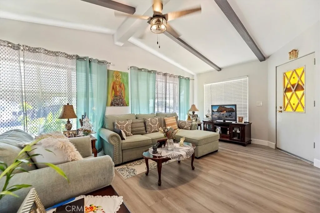 Many buyers have been waiting for a truly elevated home of this caliber to hit the market in the desirable 55+ Sharondale Neighborhood of Calimesa. You own the land and a home with a permanent foundation for conventional financing. Nestled in a beautifully landscaped, drought-resistant yard and backing to scenic mountain and tree views, this move-in-ready single-story residence offers premium finishes and value throughout. Step inside to high ceilings, recessed lighting, and wide-plank white oak-style flooring that flows across an open floor plan. The stunning remodeled kitchen shines with shaker cabinetry, quartz countertops, pull-out shelving, soft-close drawers, stainless steel appliances, and backsplash truly a gourmet space. Double-pane windows offer energy efficiency and quiet comfort. Both kitchen and bathrooms benefit from newer electrical and plumbing, ensuring modern reliability. The primary bath features a separate shower and walk-in tub, quartz counters, updated cabinetry, and newer fixtures. Additional baths follow suit with updated toilets, sinks, and easy-entry showers. Ceiling fans in the bedrooms and living areas provide comfort; fresh paint and premium finishes complete the look. Outside youll find an extended carport accommodating up to three cars, generous storage space, low-maintenance landscaping, and excellent views of the surrounding hills and mature trees. The community is distinguished by a clubhouse, pool, gym, and library maintained by the homeowners association ideal for active and social lifestyles. Located just moments from shopping in nearb