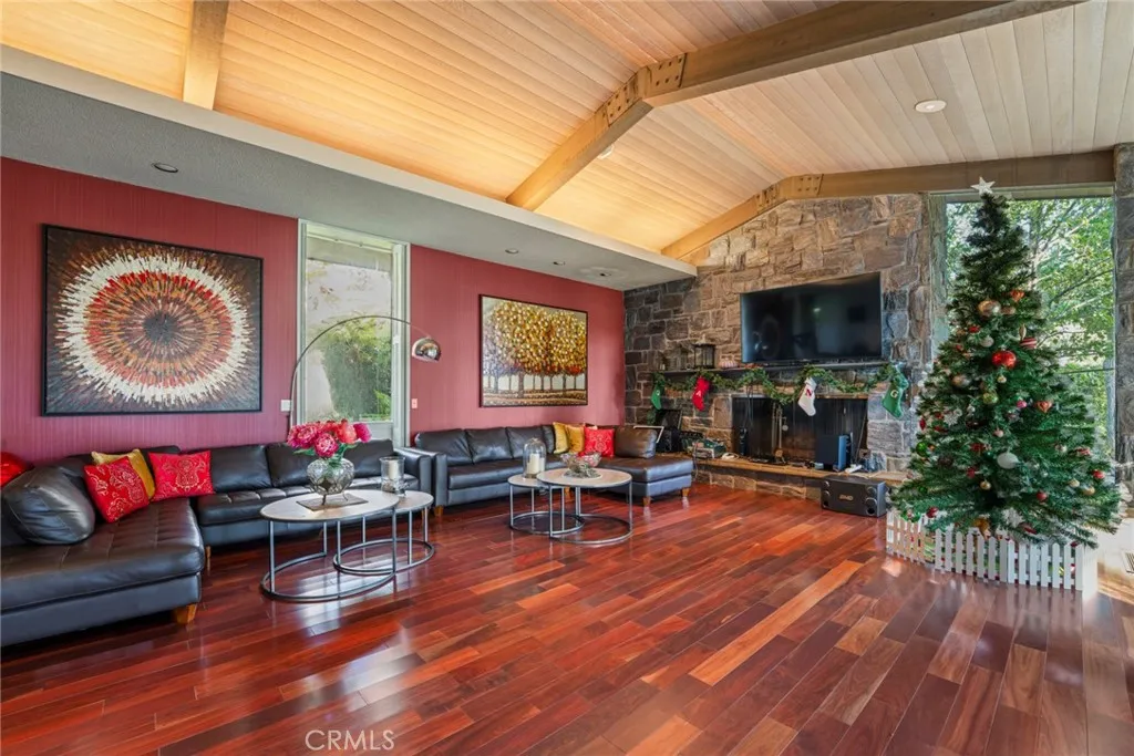 Perched on approximately 1.5 acres in the Langham Huntington enclave, this is a landmark Mid-Century Modern compound that celebrates glass, wood, and stone in harmony with sweeping garden and city-light vistas. Designed by noted architect Harold Zook, the residence showcases expansive window walls, crafted mahogany accents, and signature Bouquet Canyon stonework. An inviting foyer leads to voluminous living and dining spaces oriented to landscaped courtyards, while a catering-scale kitchen anchors a casual breakfast area and a generous family room with pool views. The private primary suite enjoys treetop panoramas, a sitting room, and dual dressing rooms/baths; four additional bedroom suites provide exceptional flexibility. Recent improvements by the current owner include a full remodel of the downstairs bedroom and new flooring throughout the home. Resort amenities span a sparkling pool, true north-south tennis court, and immersive gardens, complemented by skylights, dual-zone HVAC, security system, delivery reception area, potting shed, a four-car garage, and gated entry. A rare offering of scale, privacy, and pedigree in one of Pasadenas most sought-after locations.