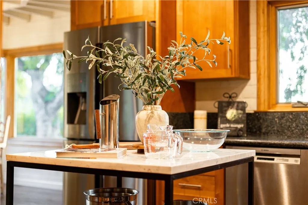 Calling all nature enthusiasts! This exceptional single-level home, set on a sprawling 39,250 sq. ft. lot in highly desirable North Monrovia, offers a rare combination of privacy, space, and modern efficiency. Sited behind a private fence and beautifully shaded by a mature oak tree, the property feels like a secluded retreat. The thoughtful, open floor plan is designed for both comfortable daily living and entertaining. Inside, you'll find a formal living room and a spacious Great Room featuring a cozy fireplace, designated dining area, and walls of windows that perfectly frame the views of the lush, expansive grounds. The kitchen is appointed with ample Shaker-style cabinetry, granite countertops, and built-in appliances. The primary retreat is thoughtfully tucked away for maximum privacy, boasting a walk-in closet and an adjoining bathroom with a dual-sink vanity. Two additional bedrooms and a secondary bathroom, also featuring a dual-sink vanity and a separate tub and shower. The outdoor space is a true highlight, offering several patio areas ideal for entertaining - a blank slate perfect for installing a pool or realizing a variety of other outdoor visions as well as a large, flat pad accessible by a winding path. Additional amenities include wood flooring, central air and heat, a dedicated utility room, and recent interior and exterior painting. The home is an all-electric residence powered by an owned solar system, offering significant energy efficiency. Parking is plentiful with a detached 2-car garage featuring upper storage, plus several uncovered spaces. Experienc