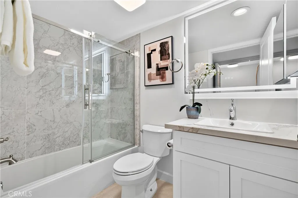 BEAUTIFULLY REMODELED CORNER CONDO ON A PRIVATE GREENBELT WITH AN OPEN FLOOR PLAN AND THREE SEPARATE PATIOS. This bottom-level residence offers one-level living with high smooth ceilings, recessed lighting, and large windows that fill the space with natural light. The den has been converted into a true third bedroom complete with doors and a closet. The kitchen, dining room, and living room are seamlessly connected, while each area, including the spacious primary bedroom, has its own sliding glass door leading to a patio. Situated down the hall, the front bedroom is conveniently located next to the hall bathroom, providing easy access for guests, while further along is the primary bedroom with its own ensuite bathroom featuring a double-sink vanity and a privacy door to the shower. Recent updates include a new roof and tenting completed in Summer 2023, with the HOA special assessment fully paid. The remodel, which is HOA approved and permitted, features a new HVAC system, porcelain tile flooring in the kitchen and bathrooms, Shaw luxury vinyl plank flooring throughout, solid core doors, elegant maple kitchen cabinets, quartz countertops and backsplashes, LED mirrors in bathrooms, a striking black marble porcelain tile fireplace wall, and fresh paint throughout. Resident amenities include two community pools and spas, with association dues covering water, trash, and exterior maintenance. Located in the acclaimed Irvine School District, including University High, this condo is conveniently situated near UCI, William Mason Park, John Wayne Airport, Newport Beach, and Fashion I