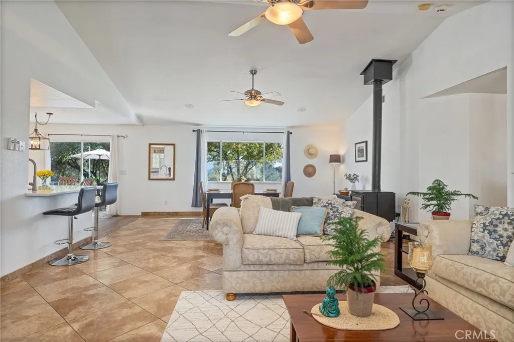 Beautifully updated 3-bedroom, 2-bathroom home on 2.6 acres with stunning VIEWS! Step inside to discover vaulted ceilings, abundant natural light, and a spacious open floor plan. The updated kitchen features a custom bar, sleek QUARTZ COUNTERS, and a large pantry for ample storage, flowing seamlessly into the dining areawhere you can enjoy distant mountain VIEWS from your table. A cozy wood stove adds warmth and charm to the living space. The spacious primary bedroom includes built-in wardrobe cabinetry and leads to a spa-inspired bathroom featuring a large walk-in shower, double vanity with quartz counters, and a walk-in closet. Two additional bedrooms and an updated guest bath provide comfort and convenience for family or visitors. Thoughtfully maintained with modern updatesincluding a NEWER ROOFthis home offers both beauty and long-term peace of mind. The property features an automatic gate and is FULLY FENCED across the entire 2.6 acres, offering both privacy and security. Outside, unwind on the generous back patio ideal for entertaining, or relax beneath the covered pergola at the front of the home, complete with a tranquil WATER FEATURE. Additional features include a fenced area perfect for animals, a workshop space, fruit trees, and a seasonal creek & POND that add a truly bucolic touch to the landscape. Move-in ready, beautifully finished, and perfectly situated on usable acreagethis home has it all!