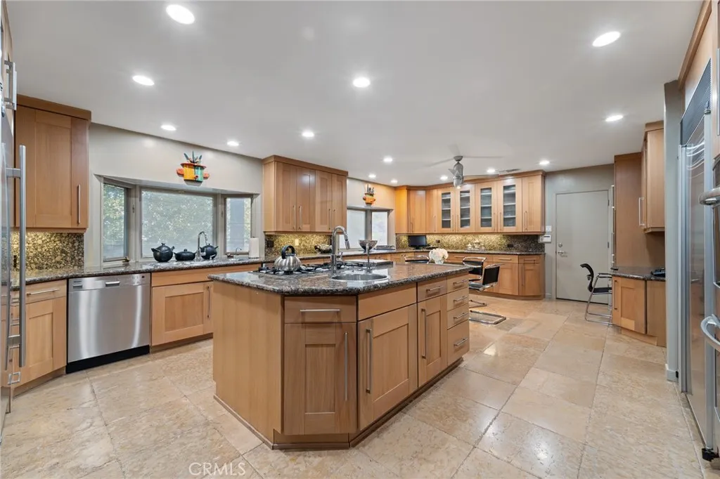 Stunning Encino Hills Estate | End of Cul-de-Sac | Lanai School District. Privately positioned above the street at the end of a quiet cul-de-sac, this exceptional residence blends timeless architecture with modern sophistication. Nearly 5,000 square feet of refined living space offers 6 bedrooms and 6 bathrooms on an expansive 15,000 square-foot lot. The heart of the home is a grand chefs kitchen featuring granite countertops, solid wood shaker cabinetry, Sub-Zero and Thermador appliances, pantry, utility room, and an oversized eat-in area. Entertain effortlessly in the formal dining room, elegant den with custom built-ins and bar, and dramatic formal living room with high ceilings, floor-to-ceiling display cabinetry, and gallery- worthy wall space for art collectors. Five bedrooms are ensuite, including a spectacular primary retreat with private stair or elevator access, spa-inspired bath, and true five-star ambiance. Luxurious finishes include honed travertine floors, real hardwood, designer carpeting, skylights, recessed lighting, three fireplaces, and three-zone HVAC for optimal comfort. The exterior makes a striking first impression with a 40-foot stacked stone waterfall along the entry walkway. The resort-style backyard is a private sanctuary surrounded by mature olive, pine, elm, and oak trees. Enjoy a PebbleTec pool with tiered spa, expansive grassy lawn, multiple dining areas, and generous lounge space perfectly suited for intimate evenings or large-scale entertaining of 100+ guests. A rare offering combining privacy, scale, and elevated design in one of Encinos m