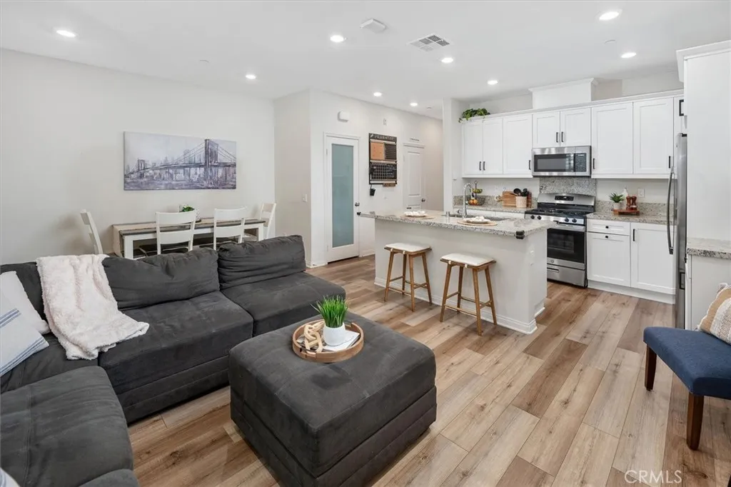3 bedroom plus loft townhome with 2.5 bathrooms, 1490 sq ft, an attached 2 car garage, and an upstairs laundry room in the Concord at River Village community. Built in 2020, this home features luxury vinyl plank flooring, plantation shutters, energy-efficient solar, a QuietCool whole house fan, tankless water heater, and an EV charging outlet. The first floor has an open concept layout with a large kitchen island, granite countertops, stainless steel appliances, dining area, living room, powder room, and direct garage access. The second floor includes the primary suite with dual sinks and a walk-in closet, two additional bedrooms, a full bathroom, a loft, and a dedicated laundry room. This home is located in a quiet section of the community with no front neighbors and a private patio. Community amenities include a resort-style pool, spa, clubhouse, BBQ area, and a tot lot. There is also a convenient neighborhood path that provides access to Central Park. Close proximity to shopping, dining, bike paths, and local conveniences. If you are searching for a newer Saugus home with modern upgrades, efficient systems, and a low-maintenance lifestyle, this is an excellent opportunity. Low HOA & mello roos. Near Emblem Elementary, Arroyo Seco JHS, and Saugus High School!