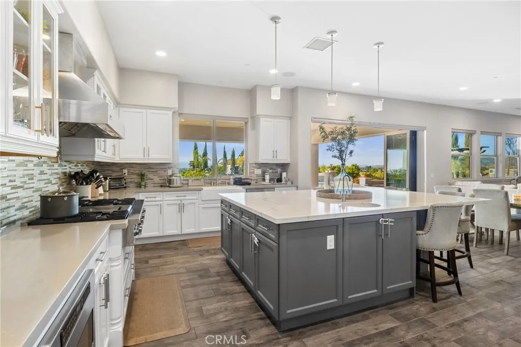 Set behind the prestigious gates of The Groves, this breathtaking 6-bedroom, 6.5-bath Tuscan-style estate embodies the perfect blend of timeless European elegance and modern Wine Country living. Located in the heart of Temecula Wine Country and surrounded by an active, certified organic citrus orchard, the 2.12 acre property offers uninterrupted vistas of rolling groves, vineyards, and glowing sunsets. Olive trees line the streets that lead to the residence, where rich architectural details and refined craftsmanship define every space. Inside, each bedroom enjoys the privacy of its own en suite bathroom, while the primary suite serves as a private retreat complete with a sitting area and a dedicated home gym. The gourmet kitchen features premium Viking appliances, complemented by a wine cellar, formal dining room, and multiple indoor/outdoor living areas ideal for entertaining. An airy atrium brings soft natural light into the homes core, enhancing its warm, inviting ambiance. Luxury and convenience come standard with paid solar, a whole-home generator, solar pool heater, water softener, reverse-osmosis drinking system, under-counter ice maker, under-counter freezer, custom shutters/blinds, and ceiling fans throughout. The resort-style backyard showcases a sparkling pool and spa, framed by panoramic views of citrus orchards and stunning sunset views. A private casita provides flexible space for guests or multigenerational living. Car enthusiasts will appreciate the expansive 5-car garage, offering ample room for vehicles, storage, or a workshop. Blending Tuscan character wi