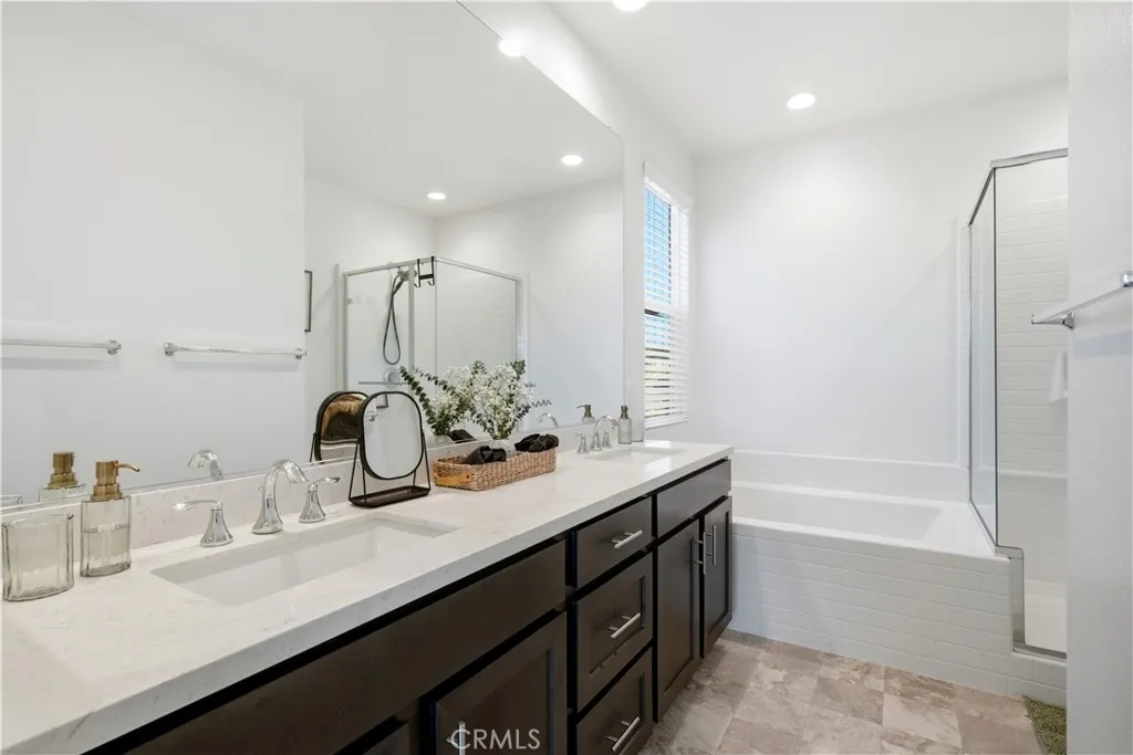 This move-in-ready home features an open floor plan, modern upgrades, and a low-maintenance outdoor living space. The kitchen includes espresso cabinetry, granite countertops, stainless-steel appliances, an oversized island with bar seating, and upgraded pendant lighting. The layout connects the kitchen, dining area, and living room, and includes an additional sliding glass door that increases natural light and access to the backyard. Interior upgrades include laminate flooring installed at purchase, updated light fixtures, a living room ceiling fan, and multiple TV mounts. The property is also equipped with 11 solar panels for improved energy efficiency. The second level offers spacious secondary bedrooms with large windows and ample closet space. The shared bathroom includes a dual-sink vanity with quartz counters and a separate shower and toilet room. The primary suite includes an ensuite bathroom with dual sinks, quartz countertops, and modern fixtures. An upstairs laundry room with a utility sink and storage cabinetry provides additional convenience. The backyard includes an aluminum patio cover with recessed lighting and ceiling fans, artificial turf, extended concrete work, a retaining wall, landscaping with trees, and a separate seating area with a firepit. The garage features a 240-volt electric vehicle charging outlet and overhead storage racks. Located within a well-maintained residential community with access to nearby parks, walking paths, shopping centers, schools, and commuter routes. This property provides a combination of functional upgrades and a flexible
