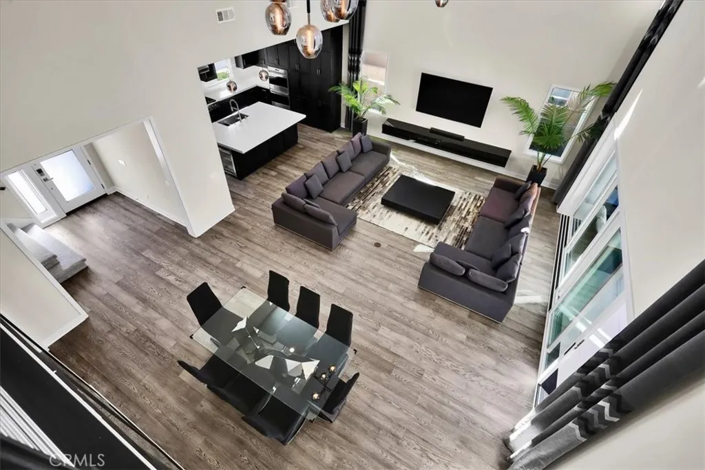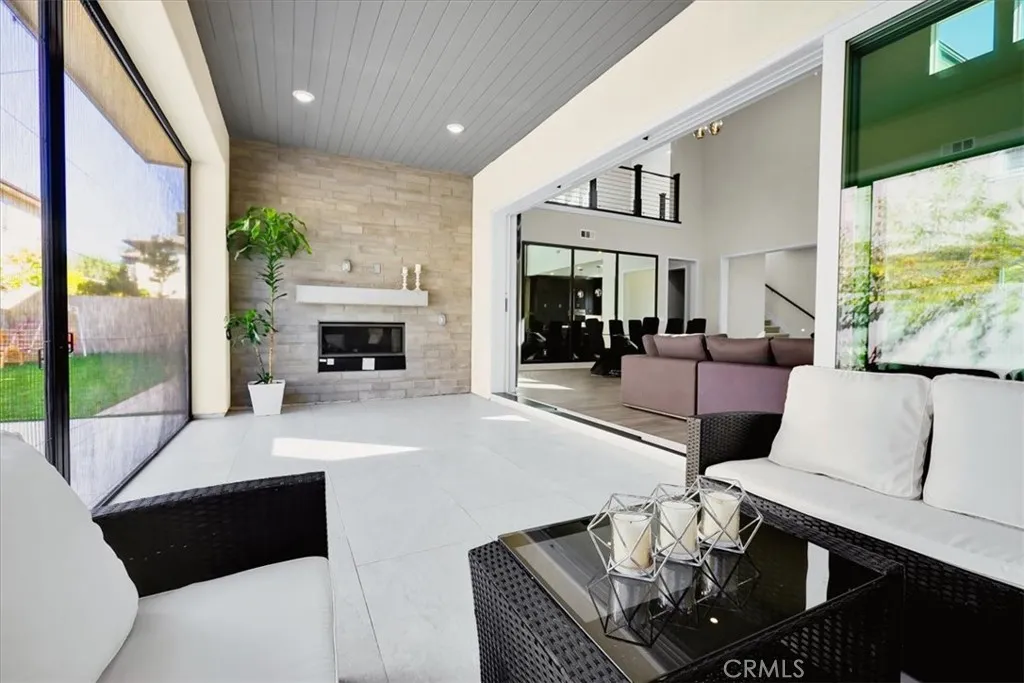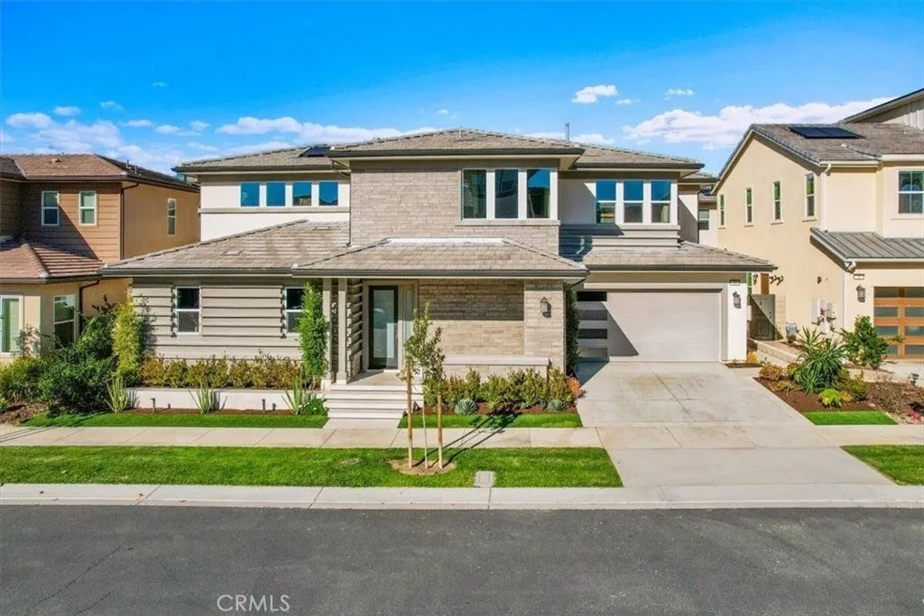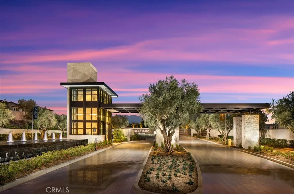 Nestled within the prestigious 24/7 guard-gated community of Altair Irvine, this cul-de-sac home combines modern design and elevated finishes throughout. The neighborhood also benefits from 24-hour security patrol throughout the community offering an added level of comfort. Beautiful curb appeal, neat landscaping, and a two-car driveway set the tone before entering through an impressive front door into a bright, open-concept interior. The main level features a breathtaking great room with high ceilings, recessed lighting, elegant fixtures, and clerestory windows that draw in abundant natural light. Hardwood floors extend through the living and dining areas, all connected seamlessly to the expansive chefs kitchen. The kitchen offers dark wood cabinetry, stainless-steel appliances, extensive storage, and a massive island with bar seating. Large sliding glass doors open to a beautifully appointed California room complete with recessed lighting and a fireplace. The backyard continues with clean hardscape and a manicured grassy lawn. The main-floor primary suite is conveniently tucked off the great room featuring tall ceilings, generous windows, and a spacious walk-in closet. The ensuite bath includes a dual-sink vanity, separate water closet, linen storage, and a large glass-enclosed shower with stone tilework, a rainfall showerhead, handheld shower wand, and built-in bench. Also on the first floor is a transition space with cabinetry that leads to a powder room, utility closet, and direct access to the two-car garage, which features additional storage. A staircase near the ent