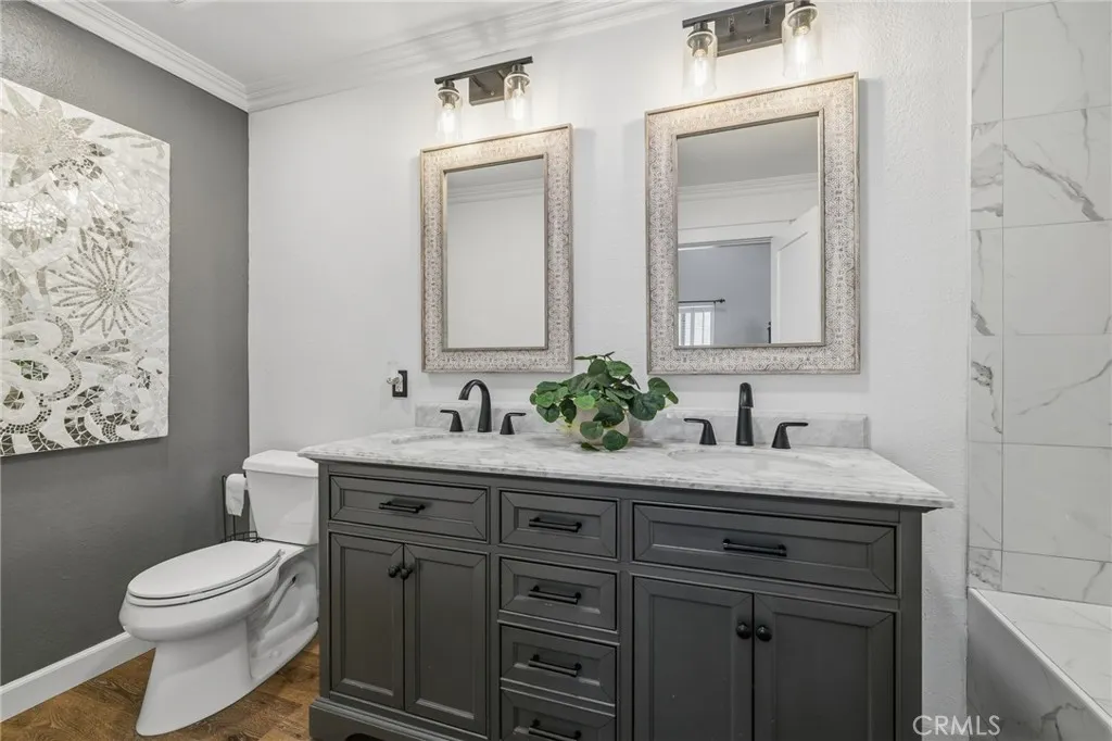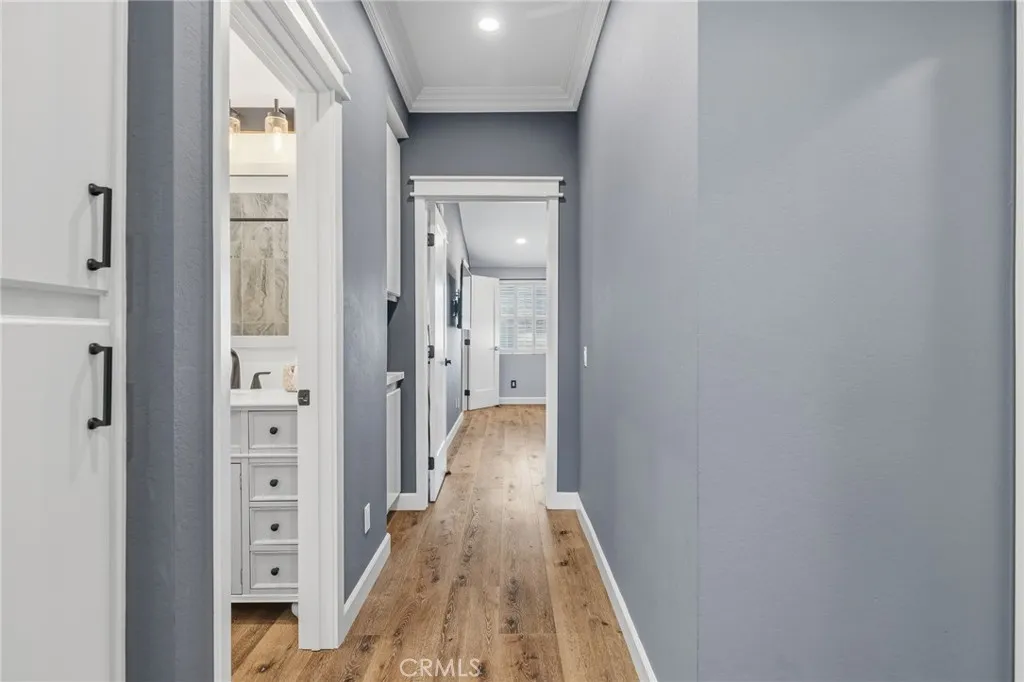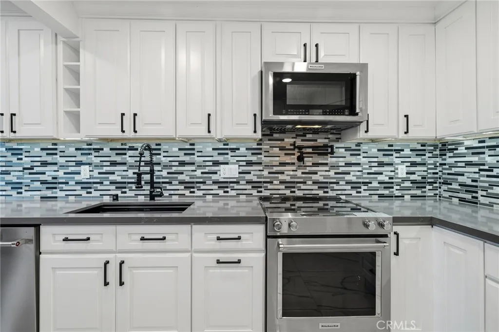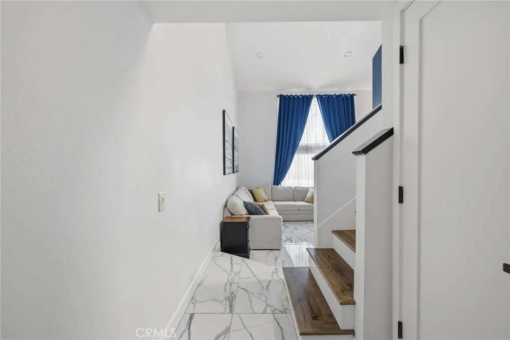 Valencia location in a private gated community, with over 1921 square feet 3 bedrooms and 2.5 baths, where every corner of this home was lovingly reimaginedrenovated not just for beauty, but for comfort, intention, and a sense of peaceful luxury. From the moment you step inside, the transformation is evident: a fully renovated, ceiling-to-floor redesign that brought this space to life. The first floor rises with 18-foot vaulted ceilings illuminated by recessed lighting throughout the living areas, creating openness, warmth, and inviting energy. Large-format porcelain tile floors flow across the level, grounding the home with quiet elegance. The newly tiled fireplace adds a calm focal point, while an 8-foot custom dining room mirror enhances light and spaciousness. The kitchen reflects the heart of this renovation. The owners raised the ceiling, added crown molding, and extended shaker cabinets to the ceiling for clean, modern vertical lines. A deep farmhouse sink, Symphony Night quartz countertops, a dedicated coffee bar, all-new appliances, and a meticulously tiled backsplash come together to support cooking, hosting, and everyday comfort. A first-floor bonus bedroom and its accompanying bath also received full renovation, each with porcelain tile flooring and fresh, elevated finishes. The staircase, rebuilt with luxury vinyl, leads to a thoughtfully redesigned second level. The full-sized loft/study features 12-foot ceilings and a skylight that fills the space with natural light. In the hallway, a 9-foot raised coffered ceiling with crown molding demonstrates how intentio
