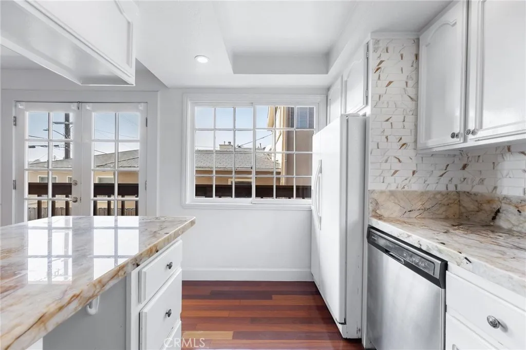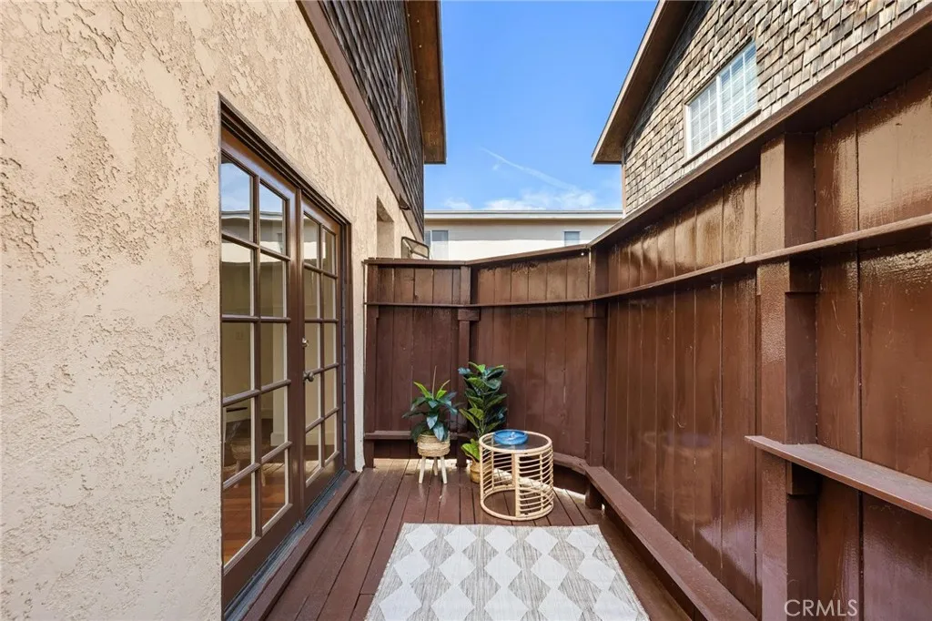 Quietly situated as a rear-unit townhome, 1515 Artesia Blvd Unit #2 is a charming retreat. Upon entry, the home is bathed in natural light and features hardwood floors throughout. The living room includes a fireplace and French doors that open to a private outdoor patio, creating indoor-outdoor flow. Just two steps up, the dining area features a second set of French doors leading to a private terrace and connecting to the adjacent kitchen, which offers ample storage and breakfast bar seating. A powder room and direct access to the two-car garage complete the main level. Upstairs, both bedrooms feature en-suite bathrooms. The primary suite offers vaulted ceilings, a private outdoor terrace, generous natural light, a large walk-in closet, and an en-suite bathroom with a glass-enclosed shower. The secondary bedroom features high ceilings, an en-suite bathroom, and ample storage. An upstairs laundry room with built-in storage and a skylight providing additional natural light completes the upper level. With easy access to downtown Manhattan Beach shops and dining, as well as LAX and major freeways just minutes away, 1515 Artesia Blvd Unit #2 presents convenience, charm, and everyday livability.