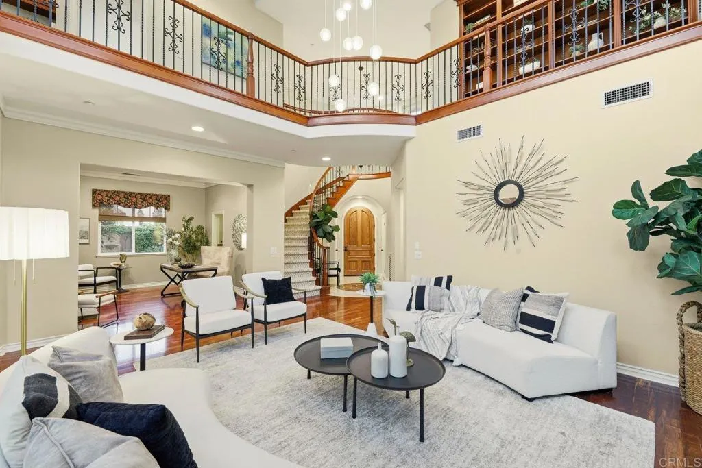 Sweeping ocean and fairway views steal the show in this sophisticated Quail Ridge home. You will be in awe as sunsets melt into the Pacific and coastal breezes set the ambiance for serene living. Perched above the 5th and 6th holes of Encinitas Ranch Golf Course, the home blends tranquility and elegance with light-filled interiors, rich hardwood floors, soaring ceilings, and refined custom finishes throughout. Designed to embrace the view, the family room and chefs kitchen flow seamlessly together, complete with an extended island, six-burner gas range, double ovens, a butlers pantry, and casual dining framed by ocean vistas. A dedicated wine room, fireside gathering spaces, and a backyard retreat with pool, spa, water feature, and built-in grill create effortless indoor-outdoor living. Upstairs, the primary suite offers the most breathtaking vantage point on the property. From its private balcony, panoramic views stretch across rolling emerald fairways to the vast blue horizon of the Pacific. Mornings begin with soft marine layers lifting off the coastline, and evenings end with the sky painted in gold and rose as the sun disappears beyond the sea. Inside, a spa-inspired bath, dual walk-in closets, and a cozy sitting area with fireplace complete this personal sanctuary. Three additional bedrooms, a flexible downstairs den, a workout room, a newer roof (2023), owned solar, an EV charger, and dual garages for three vehicles provide ease for everyday living. Just beyond the community gates, enjoy the best of Encinitas, from scenic trails and championship golf to the beaches,