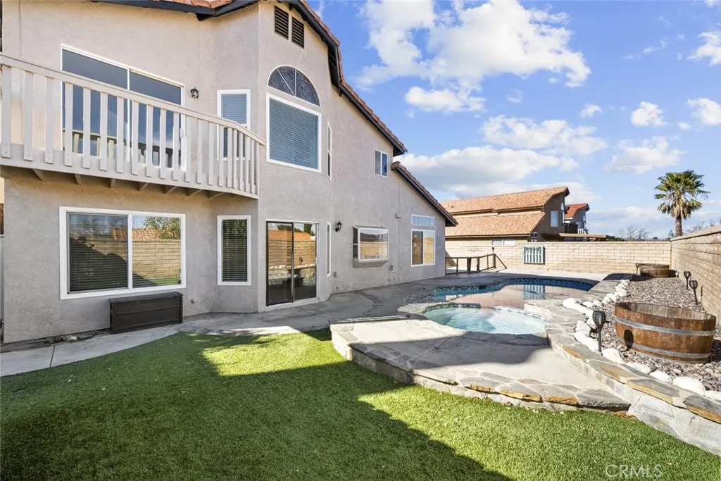 Welcome to this West Palmdale pool home with solar, designed to help ease your electric bill! Featuring 5 bedrooms, 3 bathrooms, 2,743 sq ft, and a 3-car garage, this home offers a private backyard retreat with a recently replastered pool, new pool equipment, and low-maintenance astro turf, perfect for entertaining or relaxing. Inside, enjoy dual HVAC with Nest thermostats, a new water heater, washer/dryer included, and updated upstairs bathroom with new shower and painted cabinets. Additional highlights: reverse osmosis system, water softener, security cameras, RV access, wide driveway, front yard pavers, recent windows and exterior paint, and Vivint alarm system. Plus, it's a short walk to the upcoming Amargosa Creek Trail Park, featuring enhanced trails, fitness stations, and more, ideal for outdoor recreation and fun!