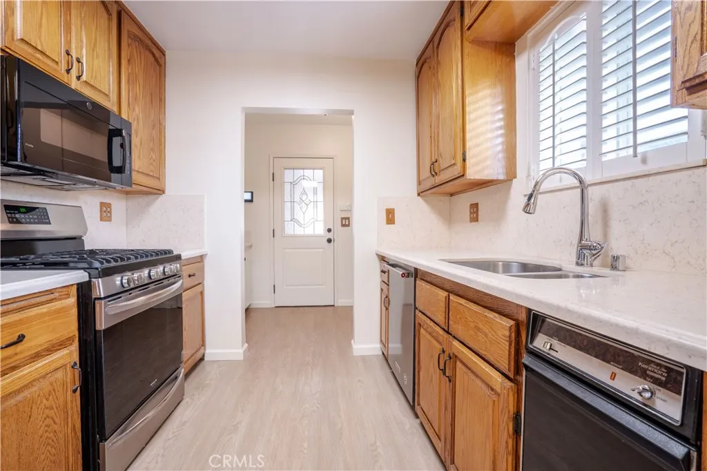 Welcome to this charming freshly painted single-story Granada Hills residence, perfectly situated on a quiet residential street. Set behind a manicured front lawn, this home exudes classic curb appeal and offers a thoughtfully designed floor plan filled with natural light. Inside, the spacious living and dining areas flow seamlessly into a cozy family room featuring a fireplace, creating an inviting space for both everyday living and entertaining. The home showcases tile and wood laminate flooring throughout, complemented by soft neutral tones that enhance its bright, welcoming ambiance. The kitchen is a chefs delight, equipped with a refrigerator (included in the sale of this home), range oven, dishwasher, microwave, trash compactor ample cabinetry, and generous counter spaceperfectly blending style and functionality, flows into the side-by-side laundry area, with counter space and additional cabinetry. This home has been updated with Dual-pane windows adding energy efficiency and modern comfort throughout the home, and offers four well-proportioned bedrooms, including a comfortable primary suite with an en-suite bathroom. Additional bedrooms are light and airy, ideal for guests, home office, or gym. Two bathrooms provide convenience and functionality for everyone. Step outside to a private backyard with multiple usable spaces, perfect for outdoor dining, entertaining, or future customization. The detached garage is larger than typical, includes a workshop, and provides additional storage and versatility. A gated driveway adds extra convenience and security. Meticulously m