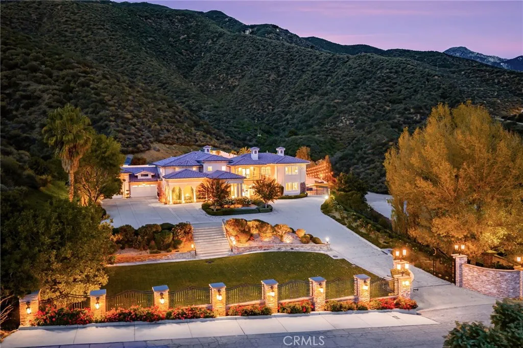 Welcome to an exceptional custom-built estate in the prestigious enclave of San Antonio Heights, where luxury, privacy, and breathtaking views converge in a truly rare offering. Beyond private gates, a grand wrap-around driveway framed by stately pillar archways creates a striking sense of arrival, surrounded by expansive, manicured grounds offering complete seclusion. This impressive three-story residence, including a fully finished basement, is thoughtfully designed and served by an elevator accessing all levels. Inside, a dramatic foyer showcases refined architectural details and crown molding throughout. Every bedroom features its own en suite bathroom and walk-in closet, providing exceptional comfort and privacy. Dual primary suites, each with a fireplace, offer luxurious retreats, while additional fireplaces in the formal living room, family room, and dining room bring the total to five fireplaces throughout the home. The chefs kitchen is a showpiece, appointed with high-end appliances, generous workspace, a wine refrigerator, and seamless flow to the fully equipped outdoor kitchen, ideal for entertaining. Additional features include a whole-house water softener system and a Generac generator that powers the entire home, ensuring year-round comfort and peace of mind. The finished basement is an entertainers paradise with a private theater, full bar, and game room. Upstairs, enjoy a fully equipped fitness room with steam shower, a spacious loft, and an elegant extended hallway enhancing the homes open flow and sophistication. Security and functionality are exceptional,