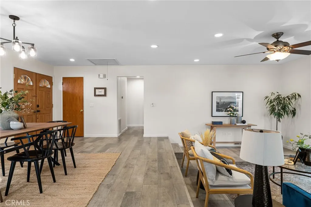 Welcome to 33 Quista Drive, a truly special North Chico home where mid-century charm meets modern design, effortless entertaining, and owned solar for energy efficiency. From the moment you arrive, the curb appeal pulls you in, clean lines, architectural interest, and a timeless look that sets this home apart. Before even stepping inside, youre greeted by a serene courtyard-style entry with a garden space that creates a calming transition from the outside world. Inside, the home opens into a stunning, light-filled layout designed for gathering, hosting, and everyday living. The dining area flows seamlessly into a sunken living room, while an elevated den-style nook overlooks the space, creating a cozy retreat perfect for reading or unwinding beside the electric fireplace insert. Two large sliders frame the living space, drawing your eye outdoors and reinforcing the homes incredible indoor-outdoor connection. At the heart of it all is the showstopping kitchen, beautifully remodeled with white flat-front cabinetry, bold black quartz countertops, brushed black onyx hardware, and stainless steel appliances. A pass-through window with bar seating makes entertaining effortless, while an impressive wall of built-in cabinetry nearby offers incredible storage for games, serving pieces, and everything in between. The bedroom layout offers thoughtful separation and comfort. The primary suite is a true retreat, featuring a spacious bedroom and a stunning en-suite bath with dual sinks set into quartz countertops, a jetted soaking tub, and a dual-head shower with rainfall feature. Just o