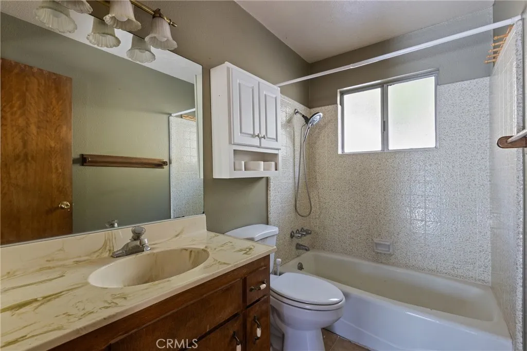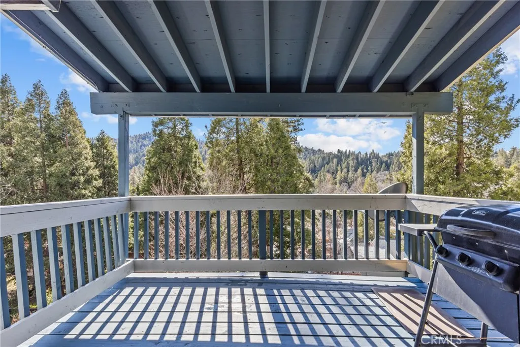 Welcome to this inviting three-bedroom, two full-bathroom home nestled among the pines of Crestline, offering 1,872 sq ft of living space on a 6,350 sq ft lot. Designed for comfort and versatility, the home features a desirable south facing orientation with multiple decks to enjoy the year round sunshine and tranquil forest views, and a completely Level 3 car parking deck attached to the property. Step inside to a spacious family room where soaring wood-beamed ceilings, tongue and groove wood paneling, and a stunning rock cladded center fireplace create a warm mountain ambiance. Just off the main living area, double doors open to a covered upper patio...perfect for relaxing or entertaining. The kitchen offers ample cabinetry, updated lighting, and included appliances. Upstairs, youll find two cozy bedrooms, each with ceiling fans, and a full bathroom that serves the level. Downstairs extends the living potential with a large game room currently outfitted with a pool table and dart area, with another opening to a second expansive south-facing deck. The lower level also features the primary suite with charming wood cladded walls, a ceiling fan, and a beautifully updated bath showcasing a subway tiled soaking tub and separate shower. Convenient laundry room access leads directly to the lower deck, offering some amazing seamless indoor-outdoor flow.. away from the elements. Additional highlights include central heating and air conditioning, parking for up to three vehicles with a level entry deck, and prescriptive easement(s) benefiting the property. Located on a quiet street y