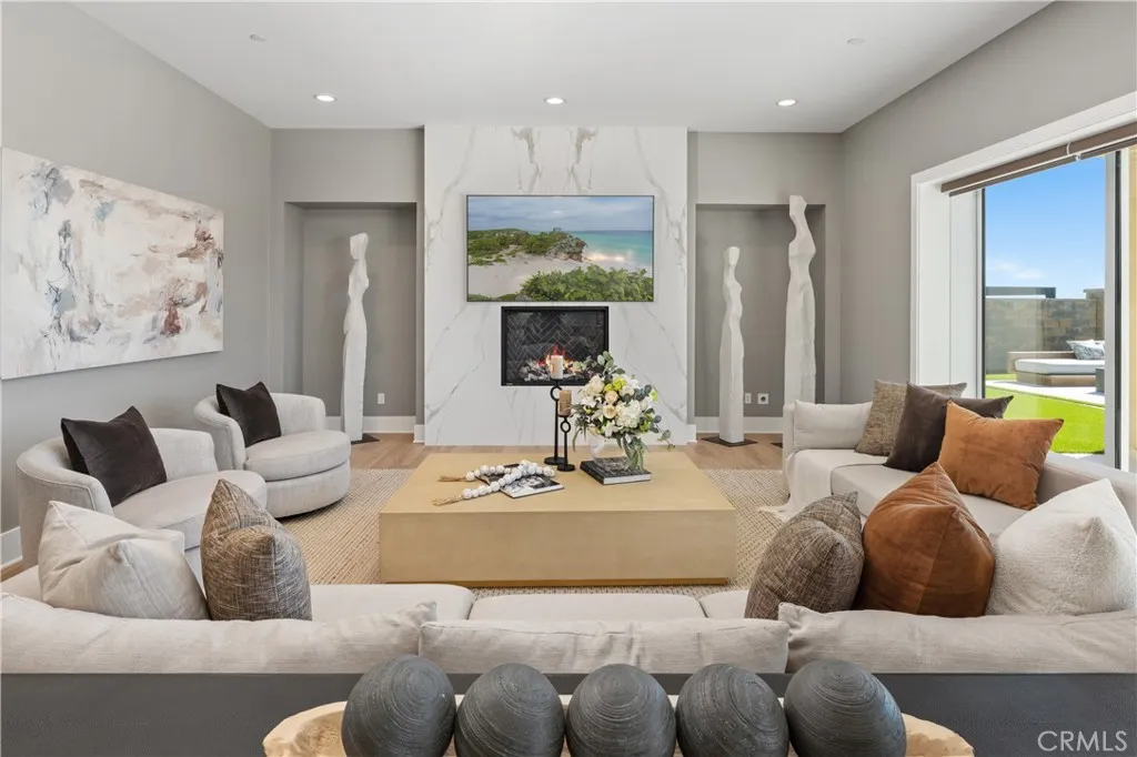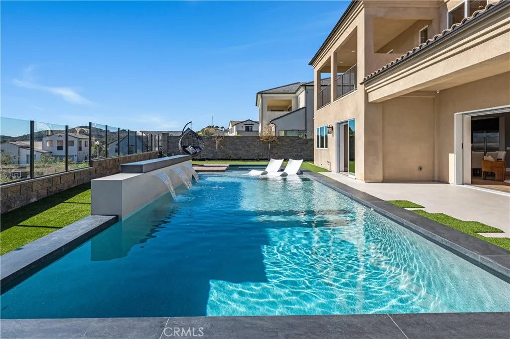 Perched atop the security gates of the exclusive Saddle Crest community, on one of the most coveted hillside lots, this extraordinary semi-custom residence captures breathtaking 180 panoramic views spanning canyons, city lights, and sunsets toward the Pacific. With over $750,000 in premium upgrades, this stunning home showcases the highest level of modern luxury and craftsmanship inside and out. From the moment you enter, youll experience refined sophisticationsmooth museum-finish walls, high ceilings, designer French Oak flooring, and a floor-to-ceiling porcelain fireplace set the tone for elegant living. Expansive folding glass doors seamlessly connect indoor and outdoor spaces, framing spectacular vistas from nearly every room. The gourmet chefs kitchen is a masterpiece of form and function, featuring a 72-inch Sub-Zero refrigerator and freezer, premium Wolf range and double ovens, two dishwashers, and an extended waterfall-edge quartz island. Ralph Lauren chandeliers accent the kitchen and dining areas, while casual and formal dining spaces invite entertaining in comfort. Thoughtful details include a dedicated dog wash and grooming room, upgraded farmhouse sink, glass shower enclosures, and automated synchronized shades. The flexible floorplan features two luxurious primary suites, one on each level. The upstairs retreat offers dual bathrooms, a spa shower, and two expansive walk-in closets, while the downstairs suite is ideal for guests or multi-generational living. Step outside to a resort-inspired backyard oasis, where glass walls frame sweeping canyon and ocean view