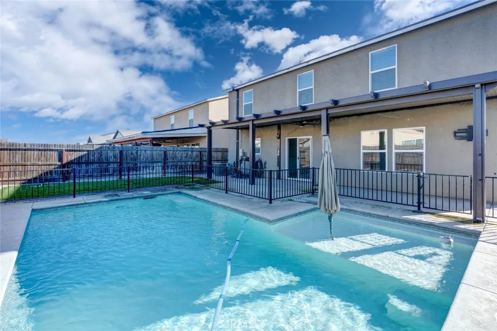 Fall in love with this stunning North Merced home with premium upgrades, located near Merced College, UC Merced, local restaurants, and shopping centers! Premium upgrades such as custom coated iron gates, an expanded driveway and a double insulated garage door with privacy windows. Boasting over 2,500 sq ft of thoughtfully designed living space, this spacious home offers 5 bedrooms and 3.5 bathrooms. Upstairs features four generously sized bedrooms, two full bathrooms, and a large bonus room/loft. Downstairs, discover a private in-law suite complete with its own bedroom, bathroom, kitchenette, and separate entrance, providing flexibility for guests or extended family. Youll also find a convenient half bathroom for guests on the main level. Step inside and be welcomed by stylish neutral tones and modern finishes. The gourmet kitchen is a chefs dream with elegant white cabinetry, sleek black hardware, stainless steel appliances, and a spacious island thats perfect for gatherings. Step outside to your backyard oasis, designed for year-round enjoyment! Enjoy the heated pool, perfect for swimming even beyond the summer months. The covered patio is ideal for entertaining, complete with built-in lighting, a ceiling fan, and an outdoor TV to host unforgettable get-togethers. Additional highlights include solar panels. Beautifully maintained and move-in ready, this home is truly a rare find in North Merced. Dont miss your chance to make it yours!