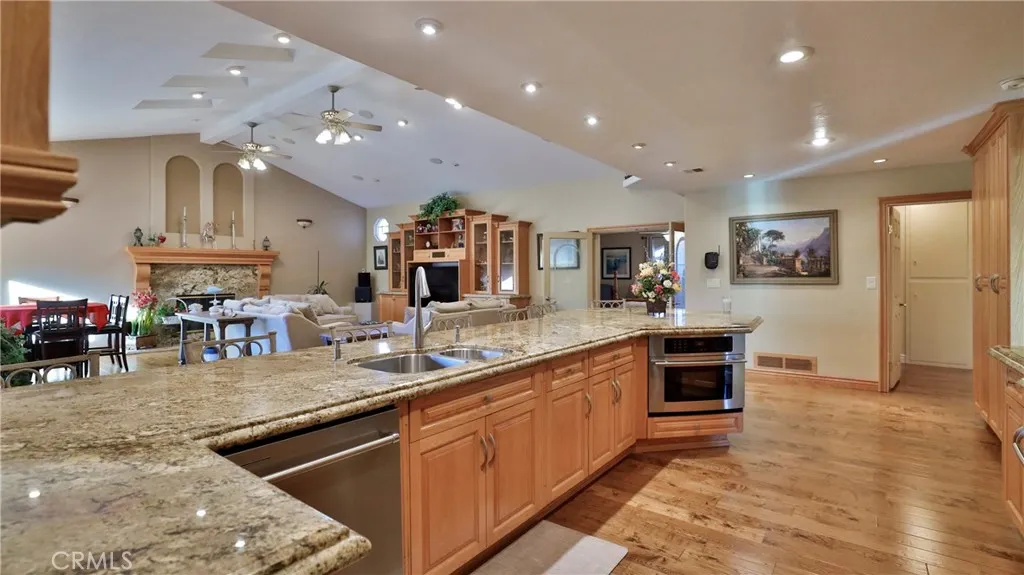 Welcome Home Move in and relax! This beautiful Upland home is ready for you to enjoy from day one. Featuring a thoughtfully designed layout, this residence combines comfort, style, and functionality for a truly exceptional living experience. Interior Highlights :Three spacious bedrooms and two full bathrooms provide ample room for family and guests. Th office can be converted to another bedroom. The upgraded kitchen offers modern finishes and conveniences, seamlessly connected to the open-concept great room with a cozy fireplace and stunning views of the backyard pool. Additional living spaces include a comfortable living room, a dedicated dining room, and a large office, perfect for working from home or pursuing hobbies. Interior features include recessed lighting, plantation wood shutters, and ceiling fans throughout for year-round comfort. The primary bedroom boasts a walk-in closet with a pull-down ladder for easy access to additional attic storage. Enjoy indoor-outdoor living with a sliding door that opens to an inviting patio and sparkling pool. A hardwired alarm system ensures your peace of mind. Engineered hardwood floors enhance the living room, dining room, kitchen, and main bedroom with both beauty and durability. Two custom fireplaces add warmth and charm to the home's living spaces. Garage and Exterior Features: A 28' x 76' detached garage at the rear of the property features four new garage doors, accommodating six or more cars, a hydraulic lift, and plenty of storage cabinets and shelving for organization. An additional RV pad includes an in-ground sewer line