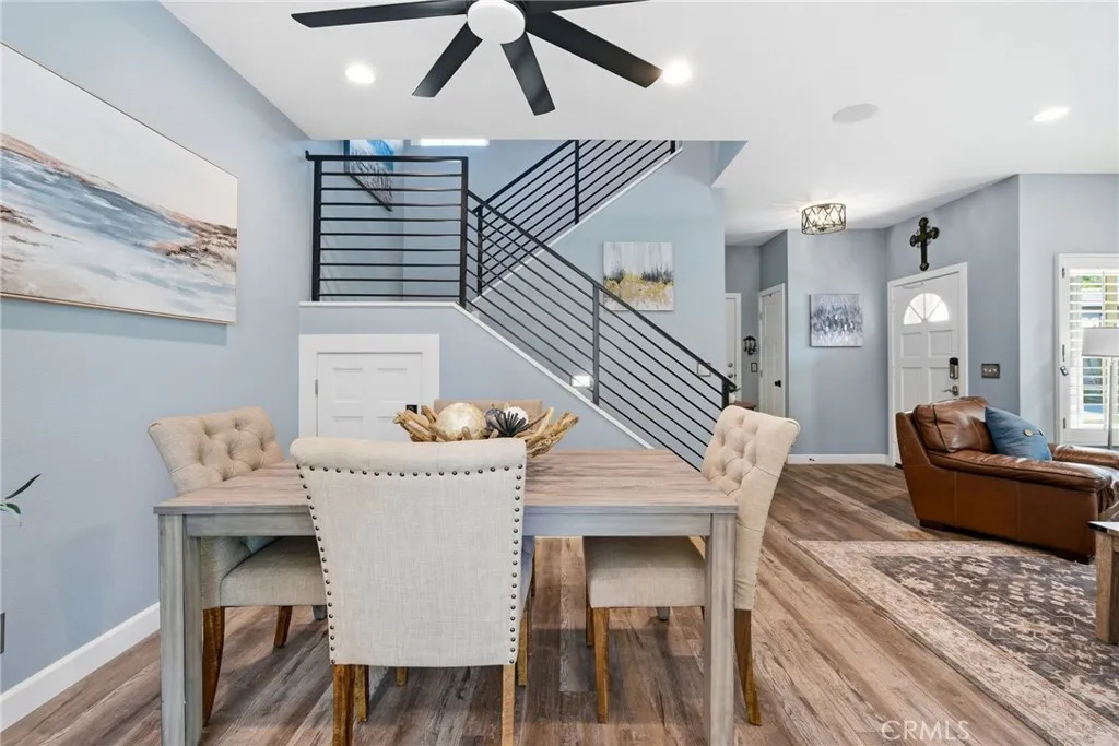 Welcome to this beautifully remodeled end-unit townhome ideally located in the heart of Aliso Viejo, just a short walk to Springdale Park. This light-filled home offers four bedrooms plus a spacious loft, providing exceptional flexibility for todays lifestyle. The fully remodeled kitchen features white shaker-style cabinetry with pull-out drawers, quartz countertops, tile backsplash, and a six-burner gas range. Stainless steel appliances, abundant counter space, and generous storage make this kitchen both stylish and highly functional. The living room showcases laminate flooring, a ceiling fan, built-in speakers, plantation shutters, and convenient under-stair storage. A cozy fireplace with a custom tile surround and white mantel anchors the space, while a new contemporary black stair railing adds a modern design touch. All bathrooms have been completely remodeled, featuring new cabinetry, sinks, fixtures, and custom finishes throughout. Upstairs, youll find four bedrooms plus a loft, all with ceiling fans, shutters, and no carpet. A large linen closet is conveniently located off the hallway. The primary suite offers a striking accent wall with wood panel detailing, a walk-in closet, and a stunning spa-like bathroom with dual sinks, custom tile work, and an oversized shower with a built-in seat. Enjoy a private, enclosed backyard with ample outdoor space for relaxing or entertaining. The garage features a clean epoxy floor, adding both style and durability. Located in a desirable community with a pool and spa, this move-in-ready home combines thoughtful upgrades, modern fin